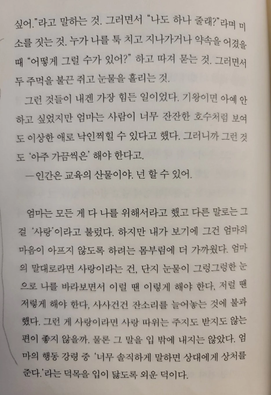 이런 그가 시간이 지나며 누구보다 사랑을 아는 사람이 되어 간다. 윤재에겐 어떤 자원이 있었을까? 우선 누구보다 열정적인 엄마와 애정 많은 할머니가 있었다. 엄마는 윤재에게 '감정'을 가르쳤다. 공부하듯이. 윤재는 엄마의 잔소리가 지긋지긋하기도 했지만 그것을 엄마의 사랑이라 애써 이해해 보려고도 했다.
