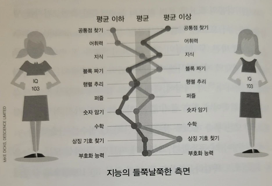 지능은 어떨까? 지능을 구성하는 차원도 역시 다차원적이다. 어떤 친구는 언어능력이 뛰어나지만 수학은 못한다. 수학에서도 대수 파트는 잘할 수 있지만 기하 파트는 여전히 약할 수 있다. 같은 이과라도 어떤 친구는 수학은 잘하지만 과학은 못할 수도 있고, 과학을 못한다고 해도 물리는 못하지만 생물은 잘할 수 있다. 다음의 그림은 보편화된 지능검사인 WAIS 검사의 10가지 항목에 대한 IQ가 같은 두 여성의 세부항목별 지능의 차이를 보여준다. 즉, 일차원적 사고를 통해서는 복잡한 데다 '균일하지 않고 들쭉날쭉한' 뭔가를 이해할 수 없다는 '들쭉날쭉의 원칙(jaggedness principle)'이 바로 이러한 차이를 설명한다.
