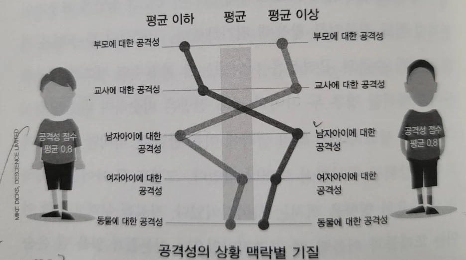 워싱턴대학교 교수인 유이치 쇼다는 여름 캠프 참여 관찰을 통해 모든 아동이 상황에 따라 여러 가지 다른 성격을 나타낸다는 사실을 밝혀냈다. 어떤 여자아이는 매점에서는 외향적이지만, 운동장에서는 내향적인 모습을 보인다. 어떤 남자아이는 운동장에서는 외향적이지만 수학 수업에서는 내향적이다(사회 시간에는 또 외향적일 수 있다!). 다음의 그림은 쇼다가 캠프에 참가한 2명의 소년을 표준적인 공격성 척도 질문지를 분석한 결과이다. 공격성 지수가 0.8로 동일한 두 소년은 상황별로 공격성이 달랐다. 왼쪽 친구는 부모에 대한 공격성은 낮고, 남자아이에 대한 공격성은 높지만 오른쪽 친구는 정 반대다. 상황 맥락별로 공격성이 달라지는 것이다.