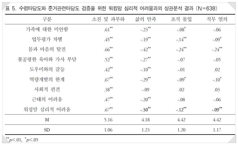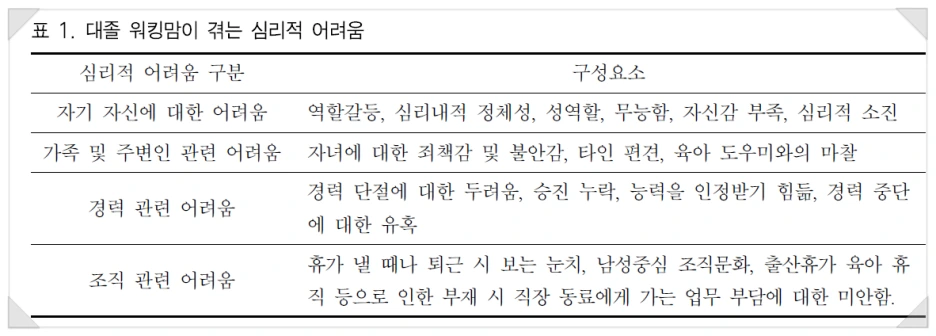 출처: 정현(Hyun Jung),and 탁진국(Jinkook Tak). "워킹맘 심리적 어려움 척도 개발 및 타당화: 대졸 이상 고학력 워킹맘 중심으로"