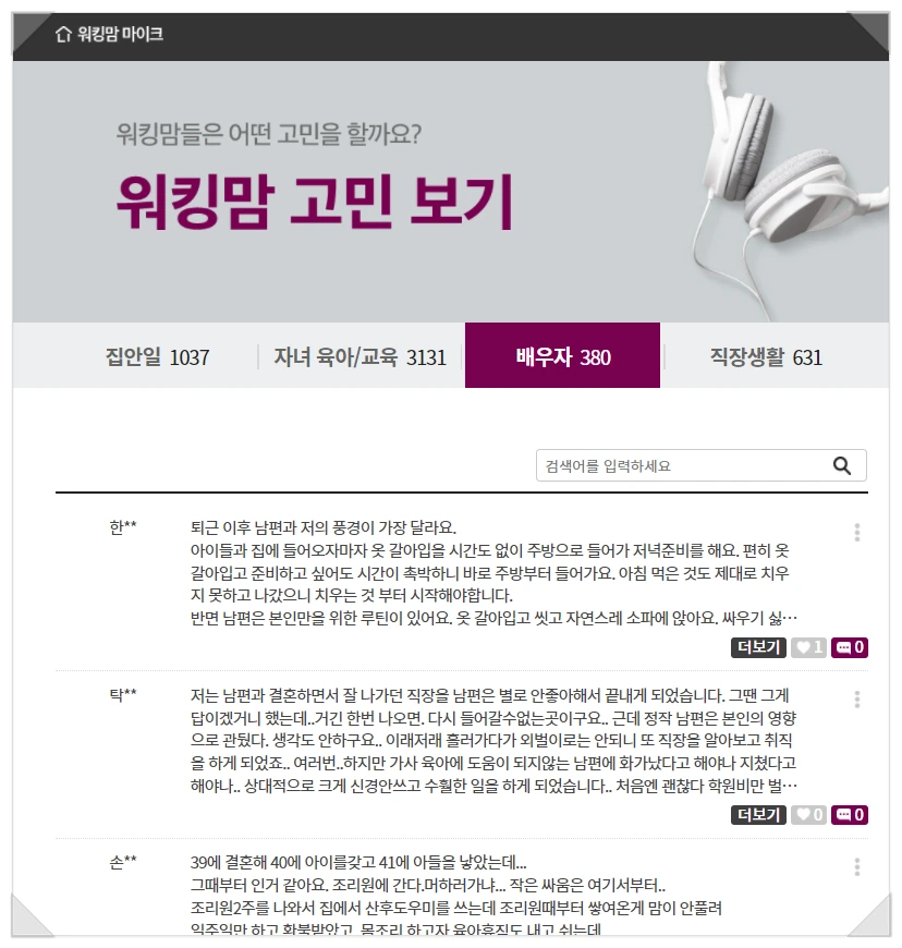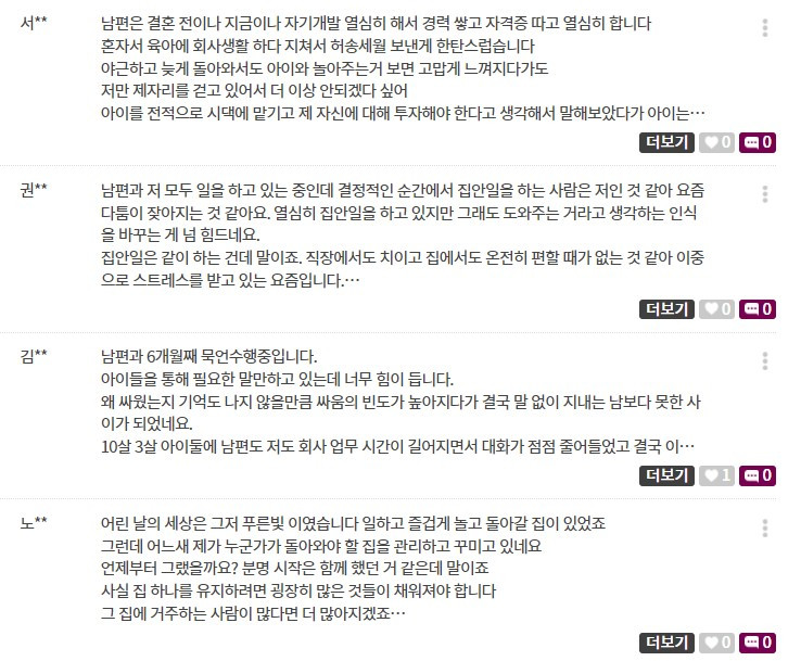 배우자에 대한 속 깊은 고민들을 엿보니 여기가 2022년의 대한민국이 맞나 싶을 정도였다. 아직도 많은 워킹맘들이 가사, 육아, 직장 일까지 병행하며 본의 아니게 슈퍼우먼이 되어야 하는 현실을 호소했다. 익명의 게시판에 남편에 대한 불평과 분노를 잠깐 쏟아 놓는 것만으로도 마음이 편안해진다고 말하는 워킹맘들도 꽤 많았다. 워킹맘들이 가장 필요로 하는 건 돈도 아니고, 가사/육아 도우미도 아닌 '남편의 지원과 이해'이지만 정작 많은 남편들은 아내가 필요로 하는 것을 주지 못하고 있었다. 한국 남편들의 경우 미국 남편들보다 그 정도가 심한 편인데 이는 통계적으로도 확인 가능하다.