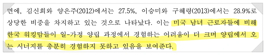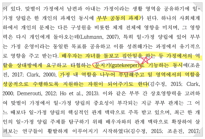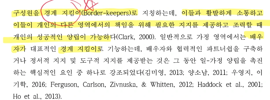 배우자의 역할은 하기 논문에서도 강조된다. 워킹맘이 일과 가정을 양립하기 위해 가장 많은 영향을 미치는 사람은'경계 지킴이(Border-keepers)'로서의 '배우자'라는 점을 다시 확인할 수 있다.