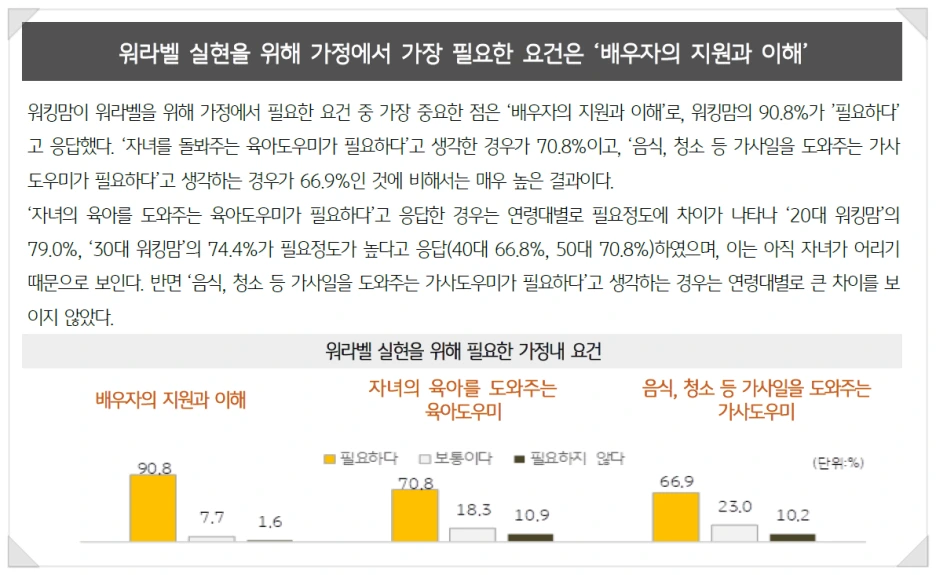 워킹맘이 워라밸을 위해 가정에서 가장 필요로 하는 건 무엇일까. KB금융지주가 정기적으로 발간하는 <한국워킹맘보고서>에서는 워킹맘들이 워라밸 실현을 위해 가정에서 가장 필요로 하는 요건은 '배우자의 지원과 이해'라고 보고했다. 무려 90.8%이다. 워킹맘들에게는 육아도우미, 가사도우미의 필요보다 '배우자의 지원과 이해'를 더 원하는 것이라 해석할 수 있다.