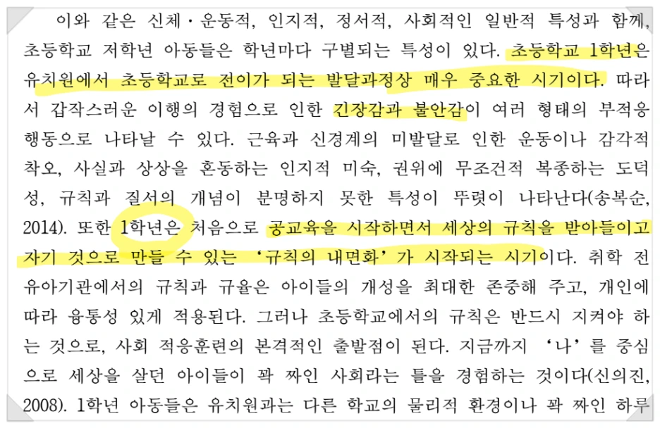 초등학교 1학년은 어린이집이나 유치원과 달리 처음으로 의무교육이 시작되는 시기로서 내가 속한 사회의 규칙을 내면화하는 첫 단계이다. 1학년 때 형성된 학습 활동의 흥미, 또래와의 대인관계, 학교 규칙에 대한 적응 정도가 이후 학교생활에 큰 영향을 미치게 된다. 여러 영역에서의 변화가 있는 시기지만, 한국의 많은 부모들은 초등 1학년을 "학업이 시작되는 시기"로 지각한다. 그래서 자녀들의 학업 역량이 준비되었는지 여부가 초미의 관심사이다. 아직은 어리게만 보이는 내 아이가 이제 사회로 나갈 첫 준비를 시작하기 때문에 엄마들로서는 자녀를 잘 도와주고 싶은 마음이 굴뚝같다. 게다가 학부모로서의 역할을 새롭게 더 부여받기 때문에 학부모로서의 새로운 역할을 어떻게 잘 감당해야 할지 긴장과 불안이 올라오기도 한다.