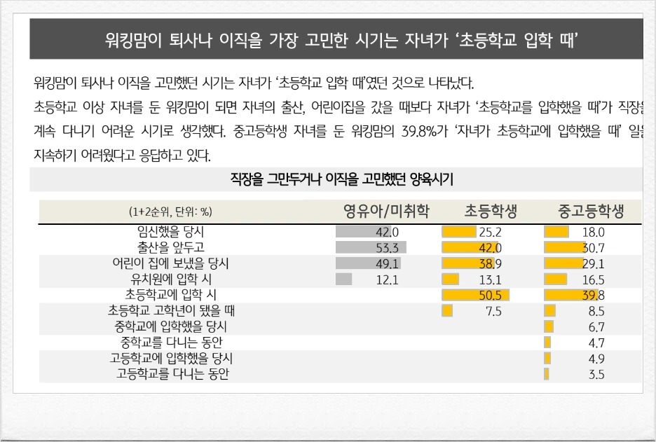 한국의 많은 워킹맘들이 퇴사나 이직을 가장 고민하는 시기는, 애착의 결정적 시기인 영유아 때도 아니고, 첫 사회관계를 배우는 어린이집이나 유치원을 등원할 때도 아니다. 바로 자녀의 '초등학교 입학 때'이다.