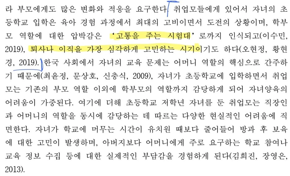 기사를 검색해 보면 '초등 1학년은 워킹맘의 무덤이다, '워킹맘에게 고통을 주는 시험대다' 등의 제목을 어렵지 않게 찾아볼 수 있다. 논문 역시 초등학교 1학년, 저학년을 둔 워킹맘, 취업모를 대상으로 한 연구가 다수 발표되어 있을 정도다. 특히 코로나 사태가 터지면서 온라인 수업으로 초등 1학년을 시작한 아이들의 워킹맘들은 혼돈 그 자체를 경험했을 것으로 보인다.