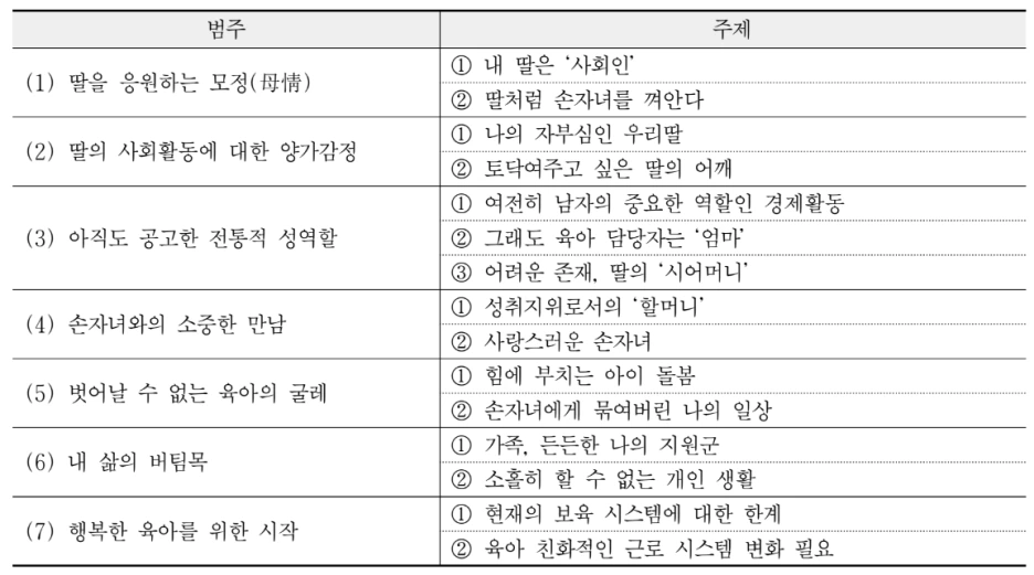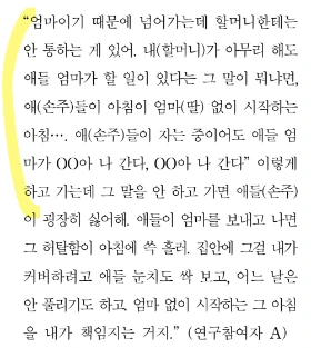 논문에 나온 7명의 60대 여성들은 모두 사회생활을 이어가는 딸에 대한 자부심과 함께 전통적 가치관에 따라 육아까지 책임져야 하는 딸에 대한 안쓰러운 마음을 동시에 가지고 있었다. 이중 책임을 져야 하는 딸의 짐을 덜어주고 싶은 마음에 황혼 육아를 하게 된 분들이 대부분이었다. 논문에 인용된 60대 여성 인터뷰이들이 인터뷰어에게 한 말들이 친정 엄마가 하는 말처럼 들렸다.
