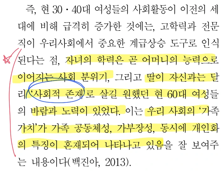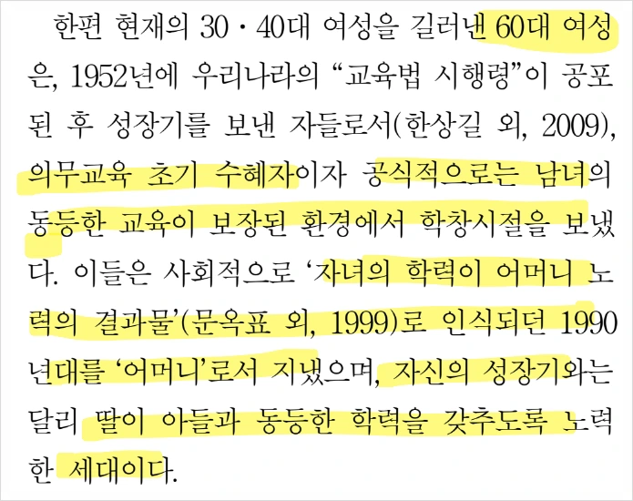 결국 30대 40대 워킹맘들이 일과 가정 모두 잘 해내어야 한다는 압박은 60대 친정엄마의 사회문화적 맥락에서 암묵적으로 전수된 것으로 생각되기도 한다.