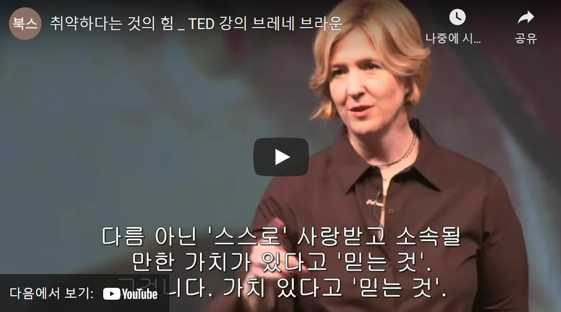 편안한 외모에, 스토레텔링 능력이 정말 좋은 사람이었다. 그런 사람이 어떻게 수치심이라는 주제를 연구할 생각을 했을지 신기하다. 책을 읽고 나니 이유를 알 것 같다. 그녀가 수치심이 적어서가 아니라 수치심 회복탄력성이 높은 사람이기 때문에 가능했던 연구이지 않았을까?