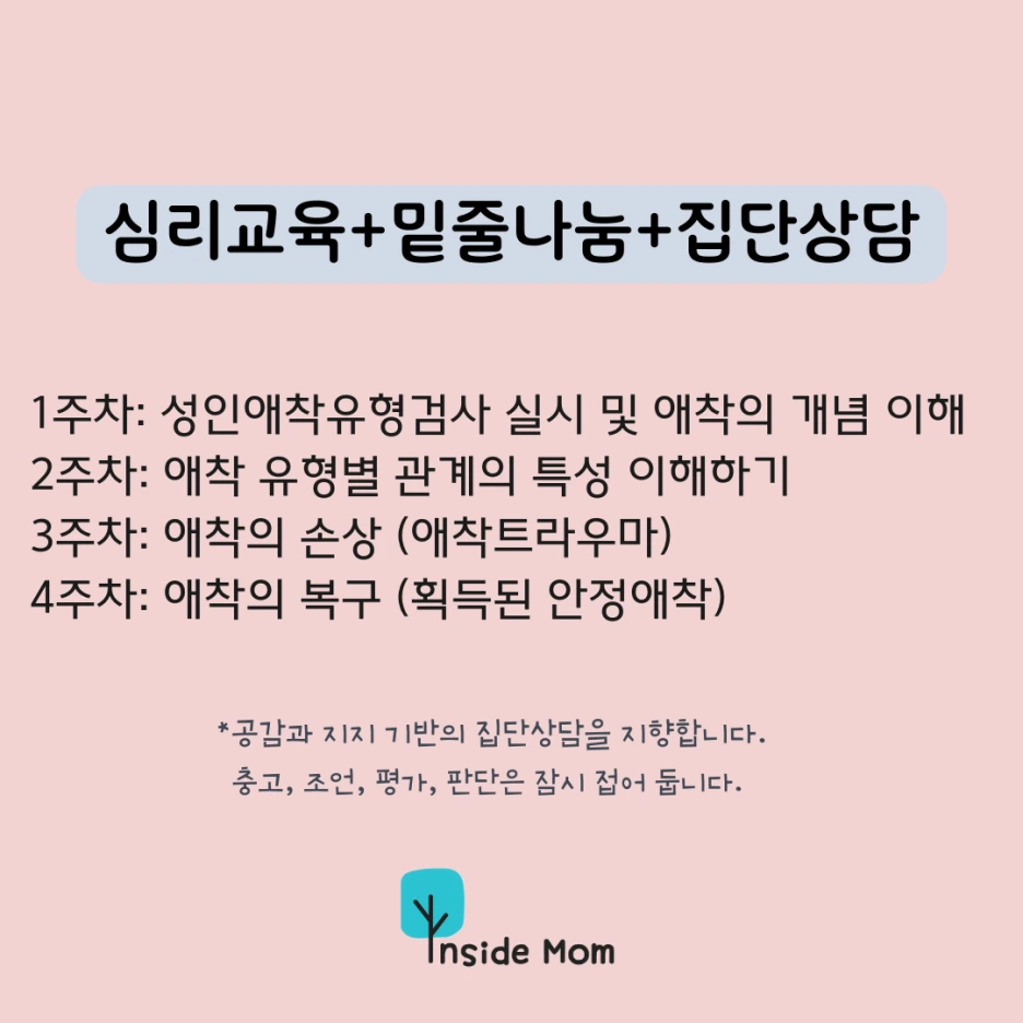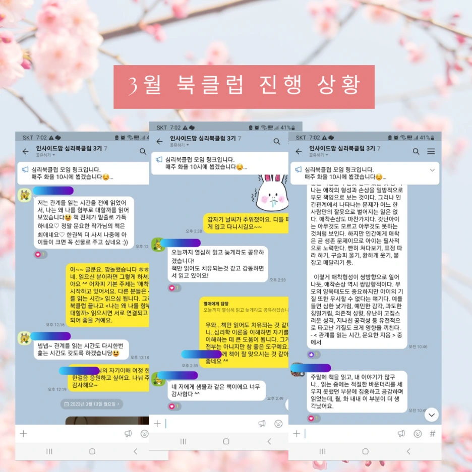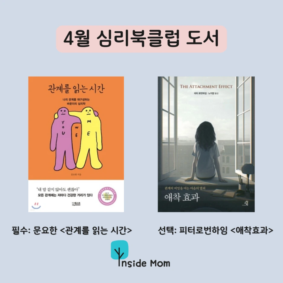 4월 인사이드맘 심리북클럽 신청서 '나'와 '엄마'의 행복한 균형을 위한 엄마콘텐츠플랫폼, 'Inside Mom 인사이드맘'에서 심리북클럽을 진행합니다. 인사이드맘은 Me+Mom이 가꾸는 내면의 정원을 지향하며, 마주봄, 자라남, 피어남 3명