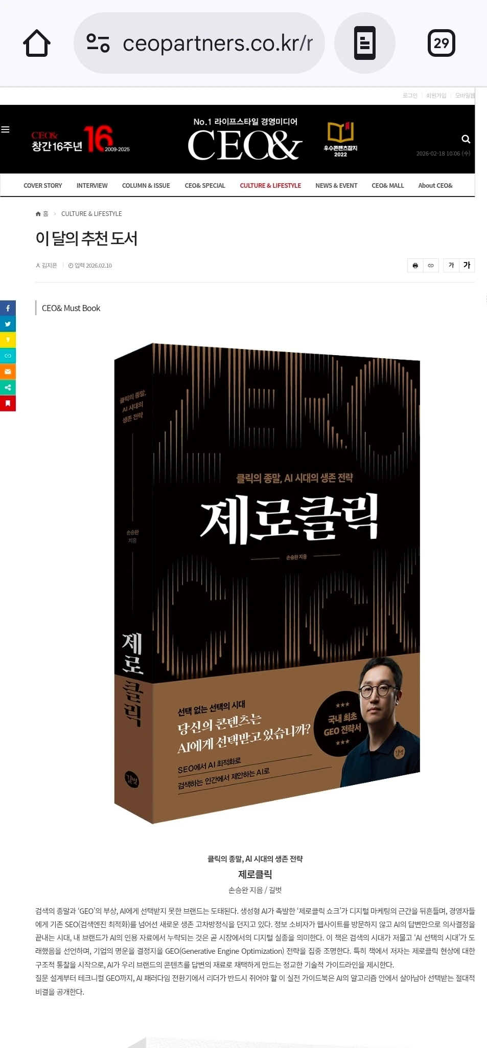국내 기업 대표님과 기업임원들이 많이 보는 유서 깊은 매거진 CEO& 에서 제로클릭을 이 달의 추천 도서로 선정해 주셨습니다.기회가 닿는다면 직접 인사드리고 감사한 마음을 전하고 싶습니다