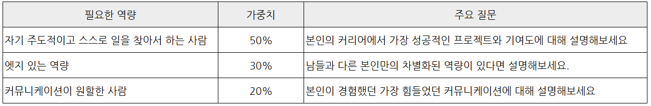 명확한 정의와 가중치까지 부여하고 면접을 진행했다면, 여러 명의 면접을 보고 나서 기억이 다소 희석되는 시점이라도 우리가 채용하고자 하는 기준이 흔들리지 않게 된다.