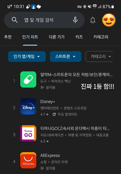 그리고 2023년 8월 17일~20일까지 구글플레이 인기차트 1위 달성하는 기쁨을 맛보았다.