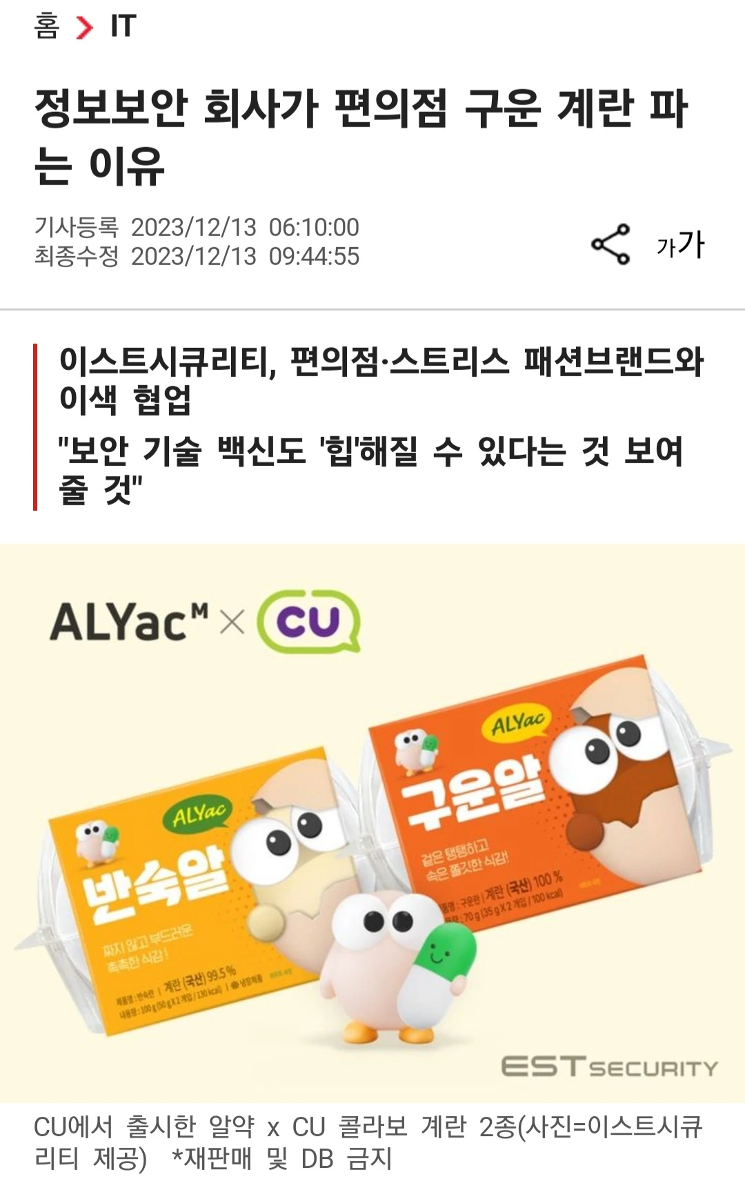 [서울=뉴시스]송혜리 기자 = 정보보안 회사가 편의점에서 구운계란을 판다? 컴퓨터·모바일 백신 프로그램 '알약' 서비스를 제공하는 이스트시큐리티가 이기종 기업들과 벌이는 이색 콜라보레이
