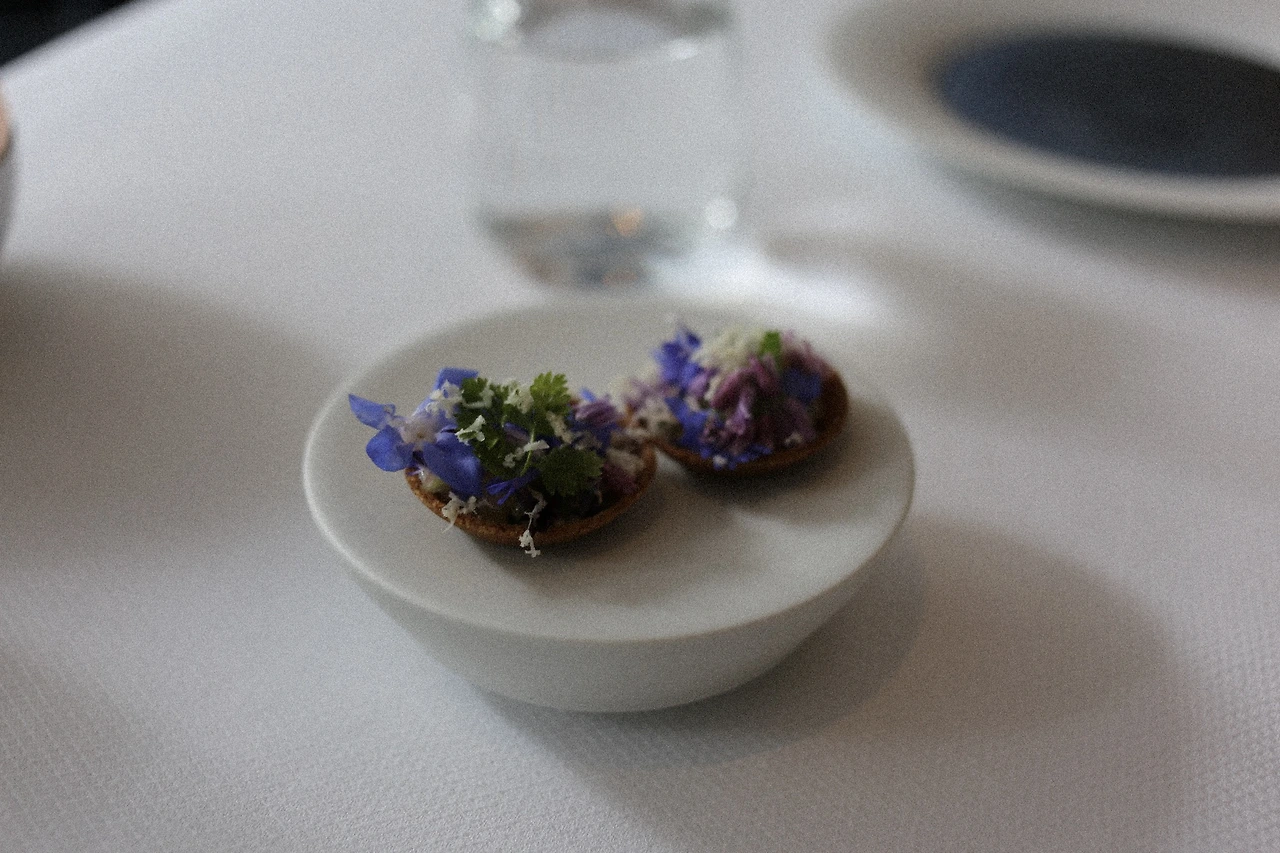 첫 번째로 나온 오르 되브르(전채요리)는 식용 꽃을 가득 올린 미니 타르트. 내가 좋아하는 호스래디시(와사비와 비슷한 맛) 크림이 들어있었는데 꽃들의 새콤한 맛과 잘 어울렸다. 보통 식용꽃을 많이 쓴 음식은 별로 좋아하지 않는데 식감과 맛이 적절했다.
