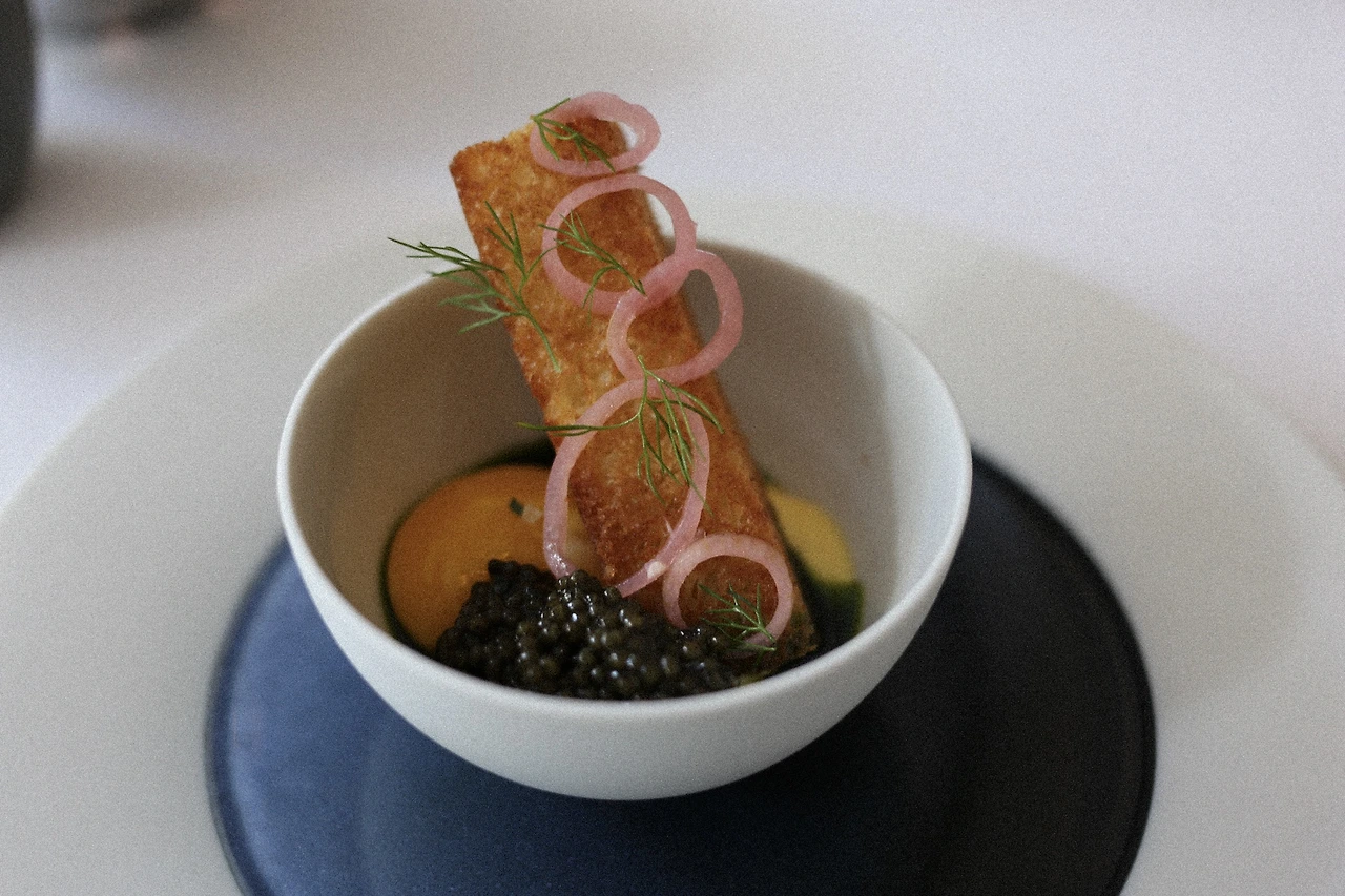 다음으로는 유명한 eggs on eggs on eggs (달걀 안의 달걀 안의 달걀). 하얀 계란 모양의 세라믹 그릇을 열면 살짝 익힌 노른자, 짭짤한 계란 소스, 듬뿍얹은 캐비아 위에 딜(dill)로 만든 오일이 뿌려져 있는 퓌레 식감의 요리를 튀긴 브리오슈 빵에 찍어먹는, 맛이 없을 수 없는 음식이었다. 느끼할수도 있는 부분을 양파피클로 잡아주어서 밸런스가 좋았지만, 위에 올려진 딜은 너무 강한 향이 나서 빼고 먹었다.