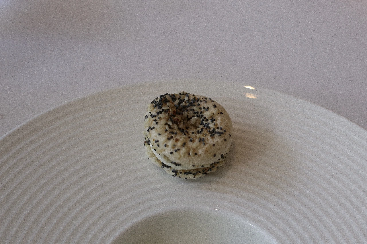 그리고 디저트를 먹기 전 또 하나의 pre-dessert가 나오는데 뉴욕의 또 다른 상징인 ‘베이글’을 디저트로 재해석한 요리다. 베이글에도 여러 가지 종류가 있는데 이 디저트의 모토가 된 베이글은 바로 내가 제일 즐겨먹는 ‘Everything Bagel’이다. 말 그대로 모든 베이글의 토핑을 다 합쳐놓은 것인데 재료는 가게마다 다를 수 있지만 보통 깨, 퍼피 시드 (poppy seed), 어니언 플레이크, 갈릭 플레이크, 굵은소금 등이 올려져 있다.