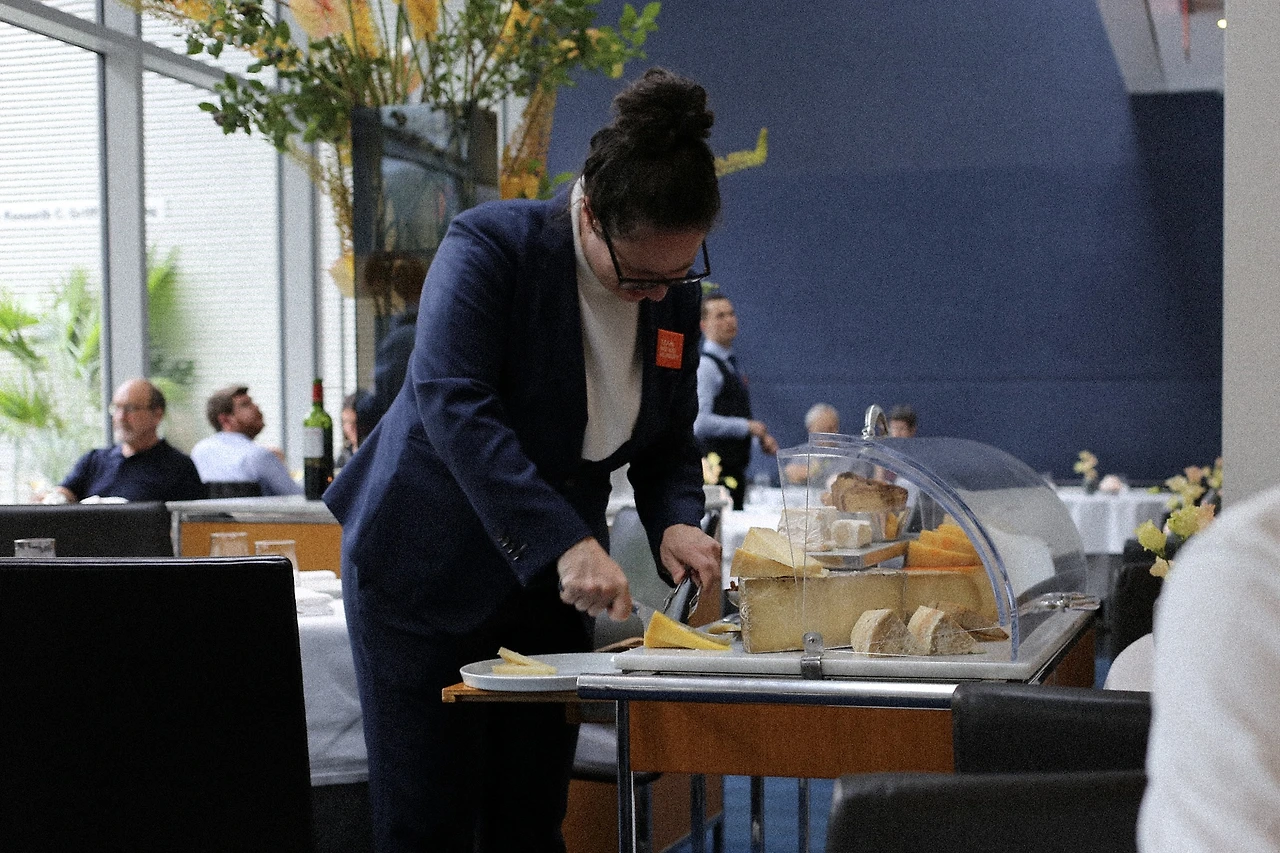 디저트를 먹기 전 치즈를 좋아하는 사람들은 돈을 조금 더 내면 취향에 맞는 다양한 치즈 조각을 맛볼 수 있는 치즈 트레이도 있다. 우리는 너무 배가 불러서 바로 디저트를 달라고 했지만 옆에서 정성스럽게 치즈를 덜어주는 모습을 담아봤다.