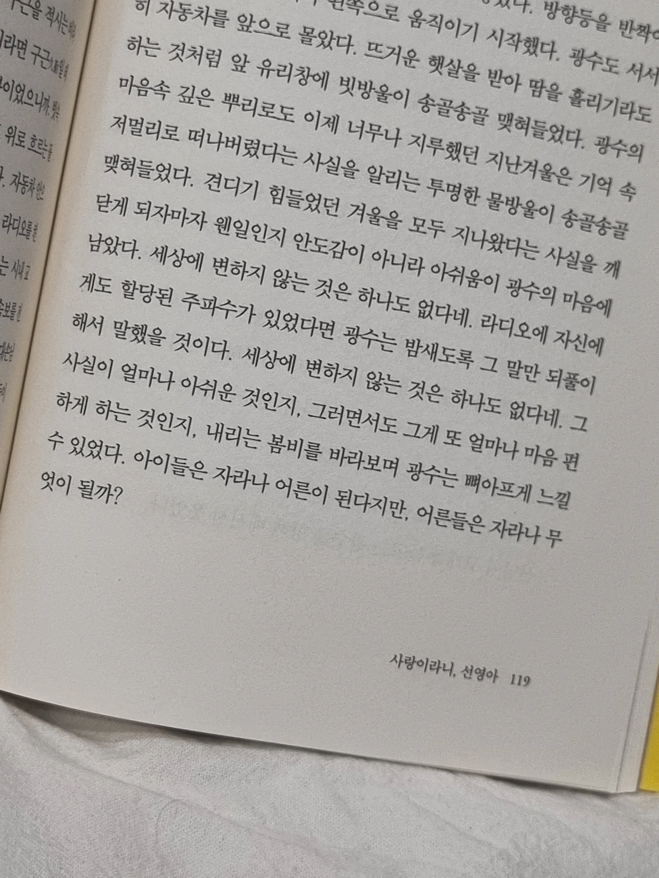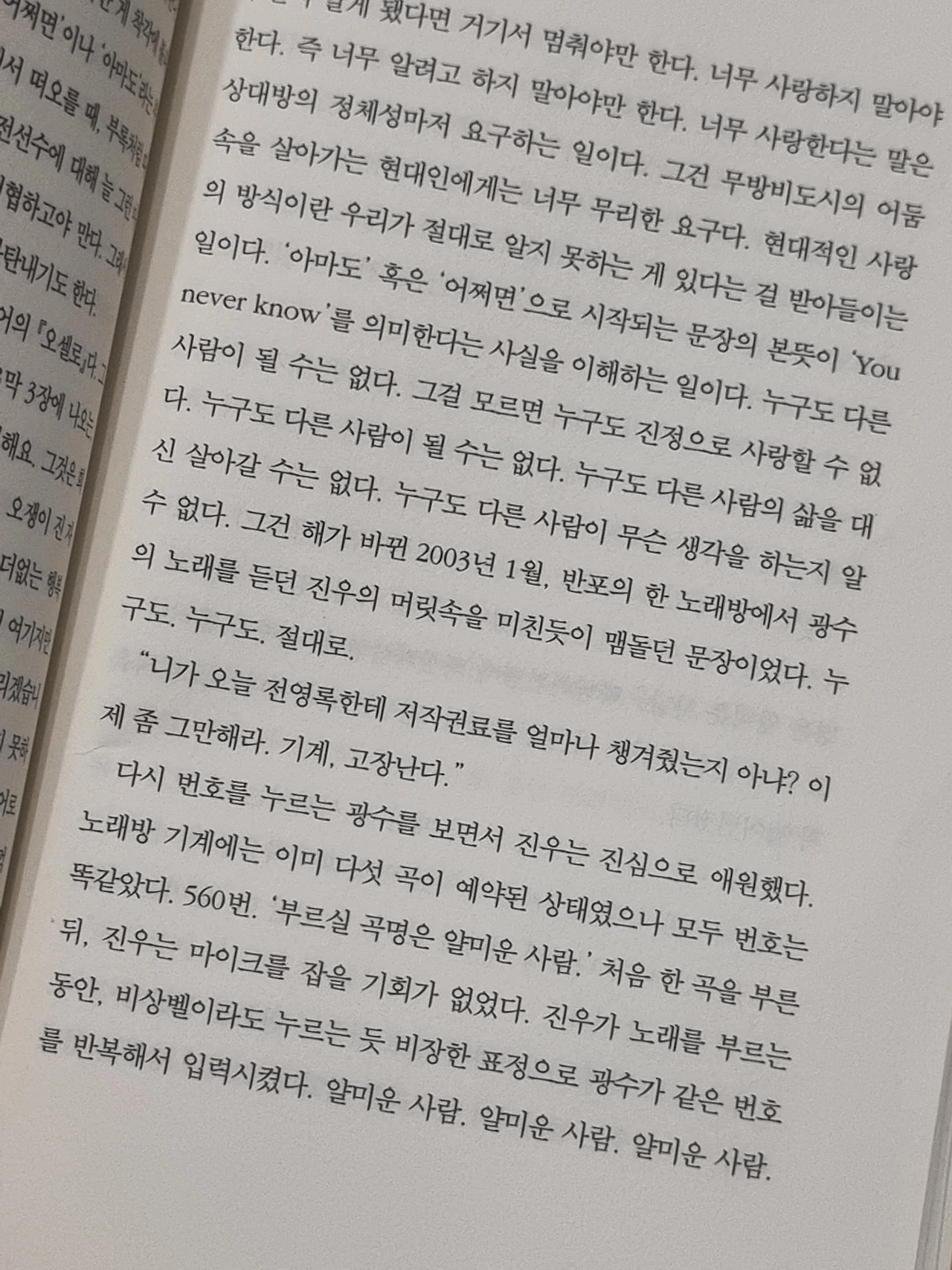 그런데 문제는 우리가 사랑이라는 관계에서 혼자서 빠져나올 때마다 뭔가를 빼놓고 나온다는 점이었다. 그리하여 사랑이 되풀이 될수록 그 관계 속으로 밀어넣을 만한 게 많지 않다는 걸 알게 된다. 그때쯤이면 누구나 자신이 누구인지 더이상 헷갈리지 않게 되는데, 그건 이제 불타는 사랑이란 자신보다 더 어린 사람들의 몫이라는 사실을 인정하는 나이가 됐다는 뜻이기도 하다.