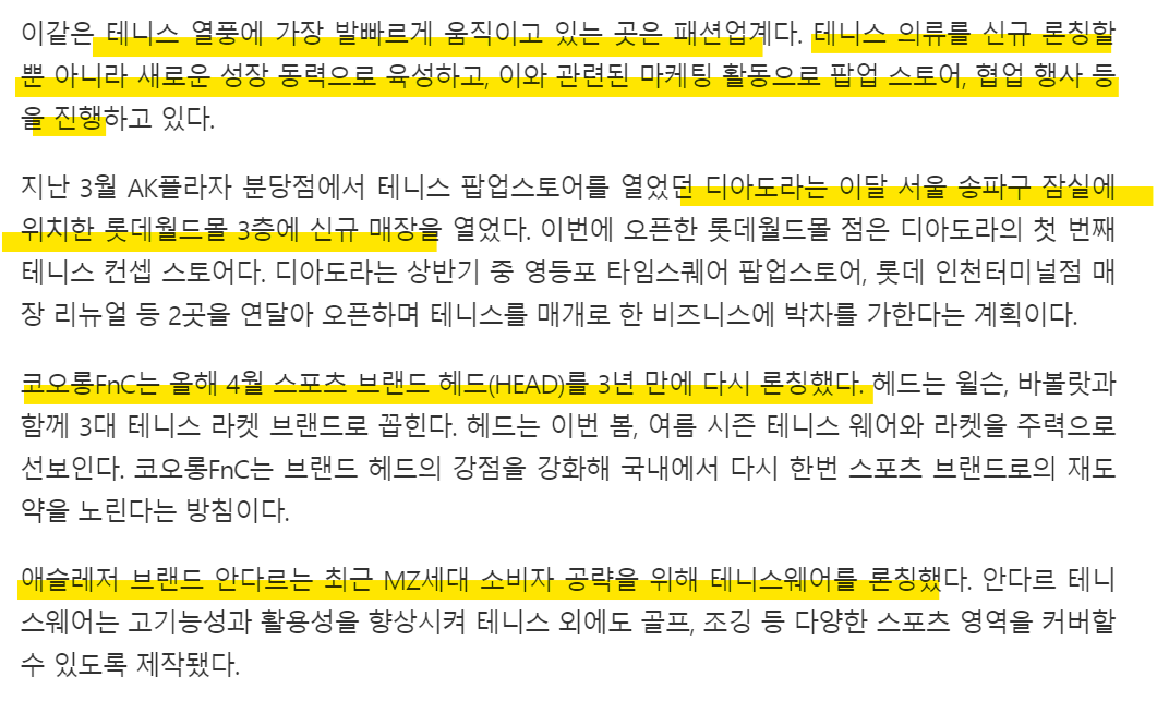 출처 : 테니스에 꽂힌 MZ…유통업계, 의류 론칭부터 코트 개설까지 (5/19)