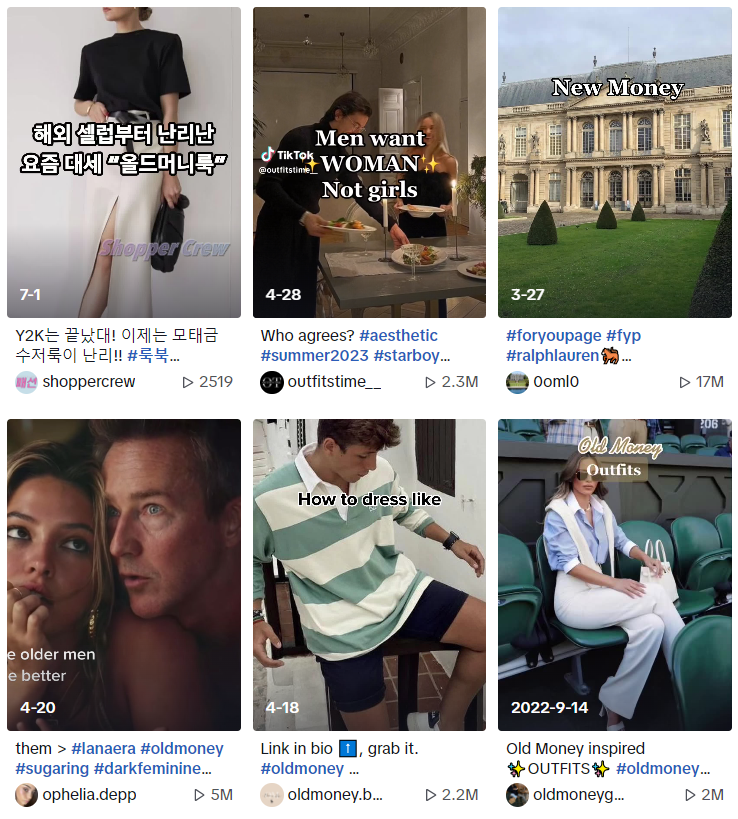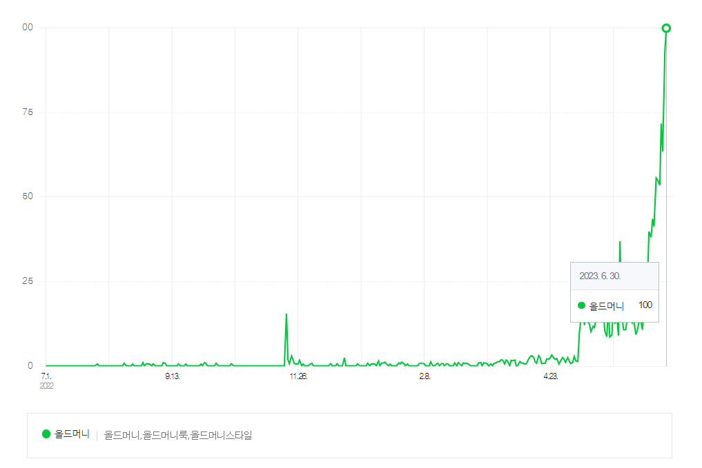 최근 틱톡에서도 올드머니룩과 관련한 영상이 증가하고 있고, 올드머니 패션의 가상 인플루언서 역시 엄청난 인기를 끌고 있습니다. 네이버 검색어를 보면, 올해 6월 말부터 키워드 량이 급증하는 것을 볼 수 있어요.