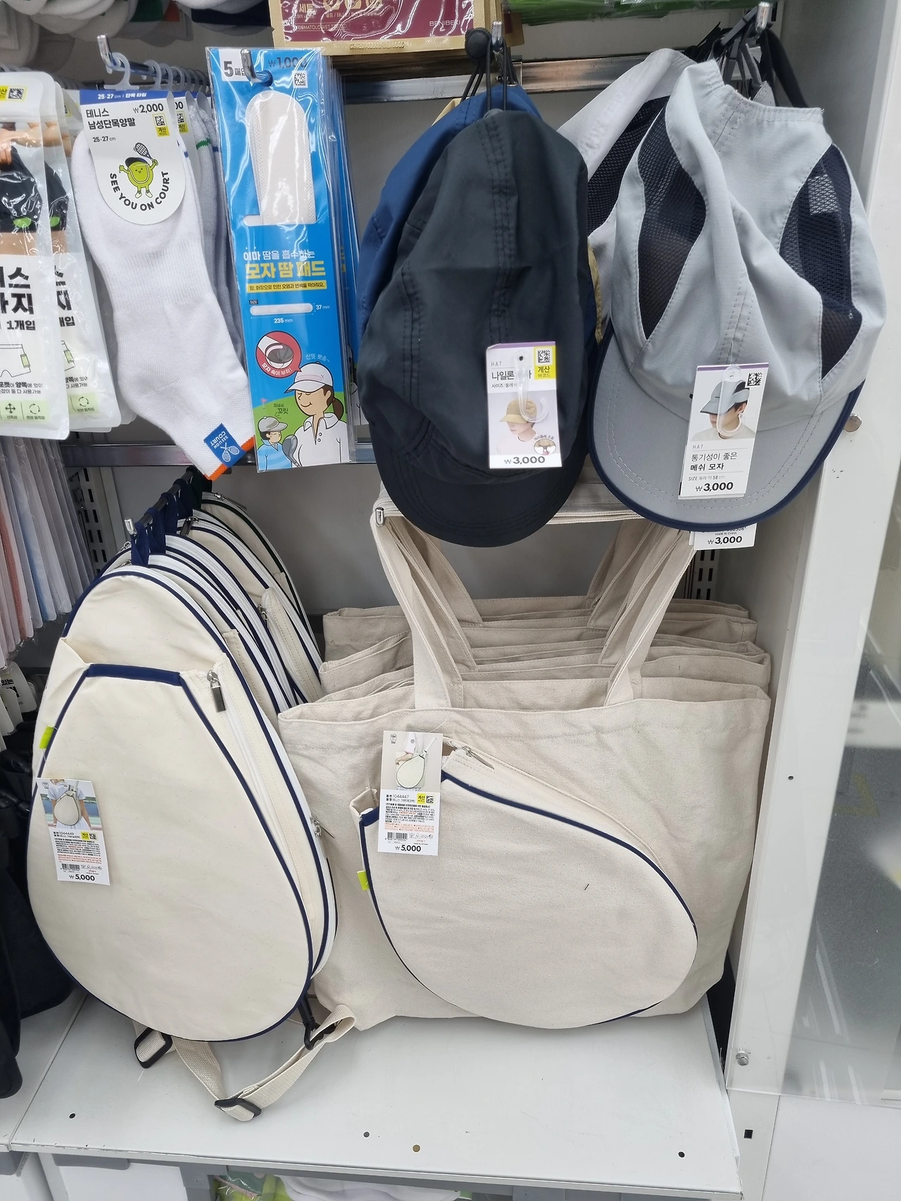 테니스 가방은 특히,, 제가 러브포티에서 구매한 테니스가방과 재질은 좀 다르지만 디자인이 똑같이 들어와서 깜짝 놀랐어요. 가격이 무려.. 10분의 1보다 쌈 ㅋㅋ 참 다이소가 물건 잘 만들어요.