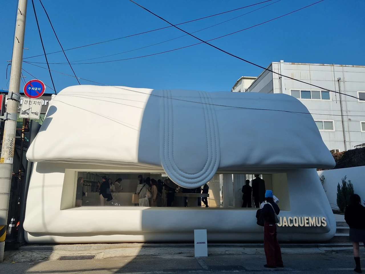 자크뮈스 팝업스토어는, 약 183 제곱미터 규모로 23년 가을겨울 컬렉션의 주요 아이템인 '밤비무'(Bambimou) 가방을 본 딴 외관으로 제작되었습니다. 마시멜로우처럼 부드럽고 폭신한 텍스처를 완벽하게 살려 동심을 자극하는 디테일을 더했다고 합니다. 저 폭신 폭신한 외관이 호감을 극대화시키지 않나요?