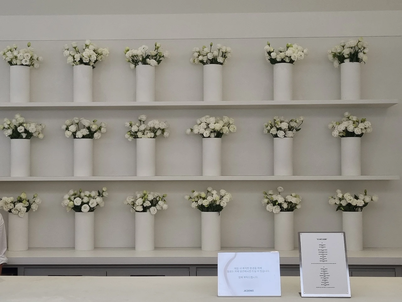두 번째 공간은 '플라워 코너'로 로고 패키지에 청초한 화이트 톤의 리시안셔스를 풍성히 담아낸 부케를 매일 한정 수량 판매했습니다. '변치 않는 사랑'을 뜻하는 리시안셔스의 꽃말에 의미를 담아 완벽한 선물을 준비할 수 있는 자크뮈스의 부케라고 합니다. (다들 사진 찍길래 공짜로 주는 건 줄 알았지만요) 가격은 겨우 3만 8천 원 정도입니다...(!)ㅎ