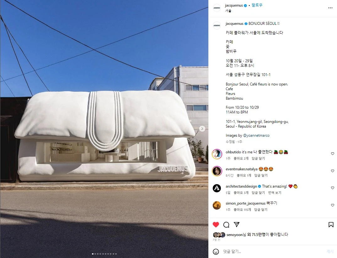 그중에 뭐니 뭐니 해도 비쥬얼로 압도한 것은 자크뮈스 팝업 스토어였습니다. 자크뮈스 팝업스토어는 10/29일까지 성수동의 카페 오우드 성수 1호점에서 진행되었습니다.