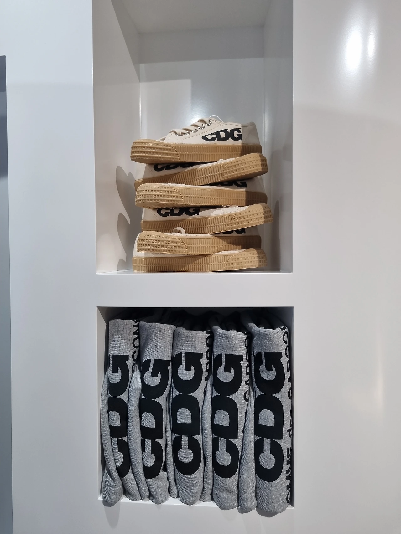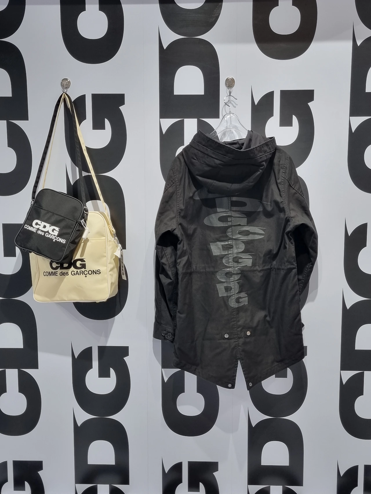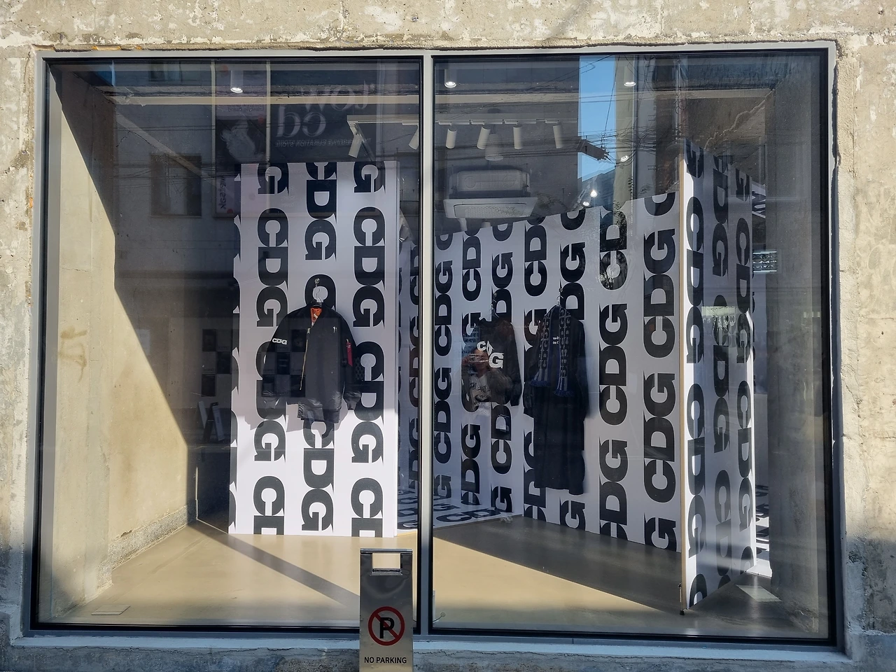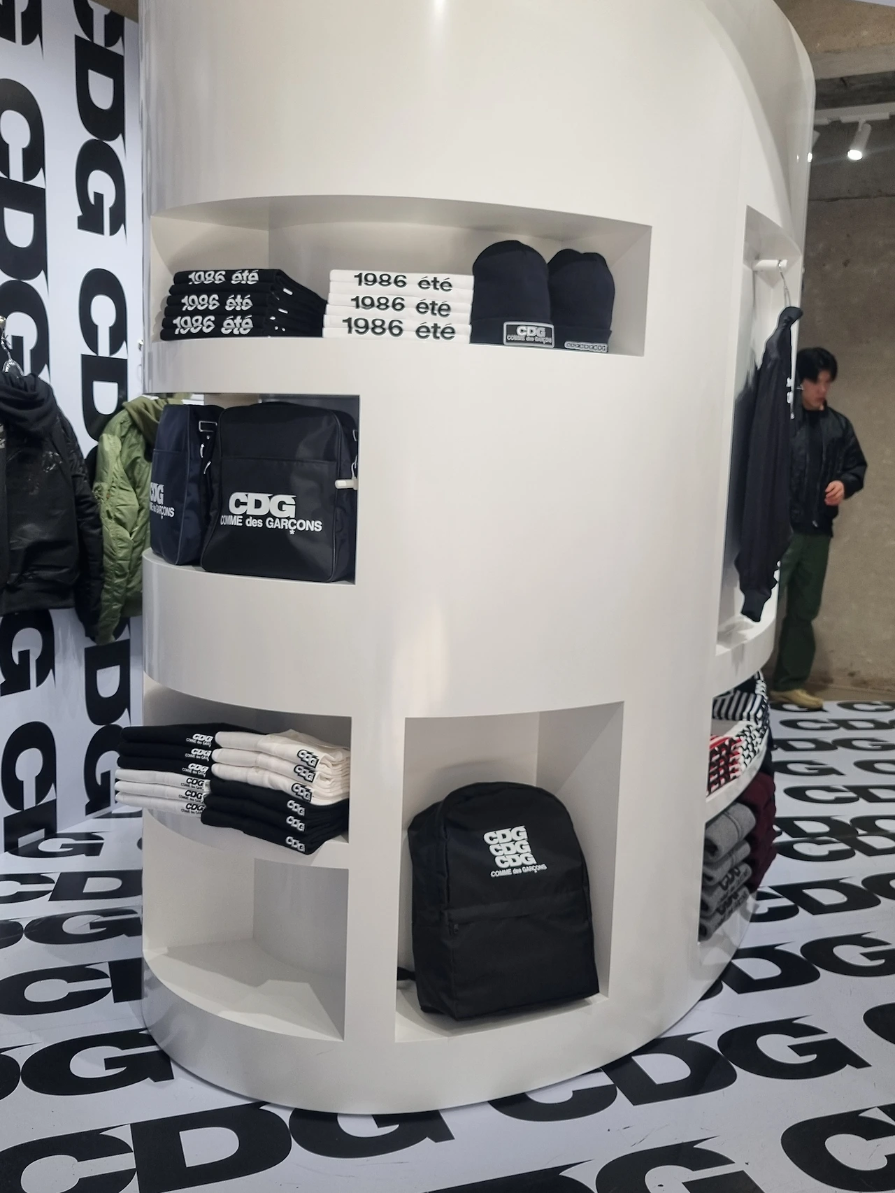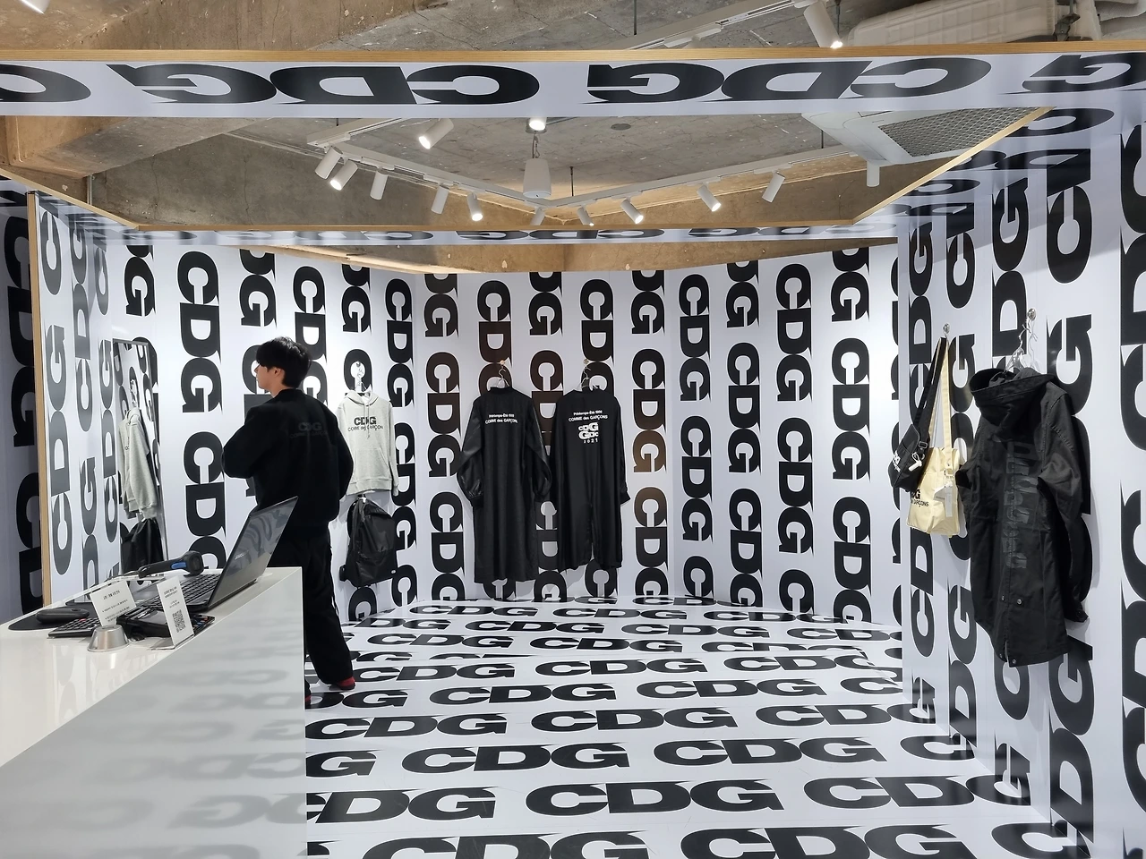 이번 팝업스토어는 무엇보다 CDGCDGCDG의 강렬한 로고 플레이를 강조하는 비주얼이 눈에 띕니다. 화이트 컬러에 블랙 시그니처 로고 프린트는 온 바닥과 벽면을 뒤덮고 있습니다.