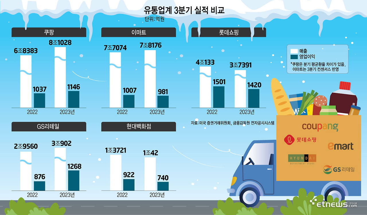 최근 3분기 실적 발표 결과, 유통업계의 지도가 점점 바뀌고 있는 게 명확해집니다. 쿠팡이 이마트를 넘어섰고, 그 외의 중위권 유통사들도 나름대로 쿠팡과 이마트 사이에서 차별화 전략을 세우고 있습니다. 어떤 유통업체는 빅모델과 럭셔리 및 프리미엄을 강조하기도 하고(롯데온), 백화점 사들은 리뉴얼 및 F&B, MZ세대 공략을 통해 집객 효과를 누리려고 하기도 합니다.
