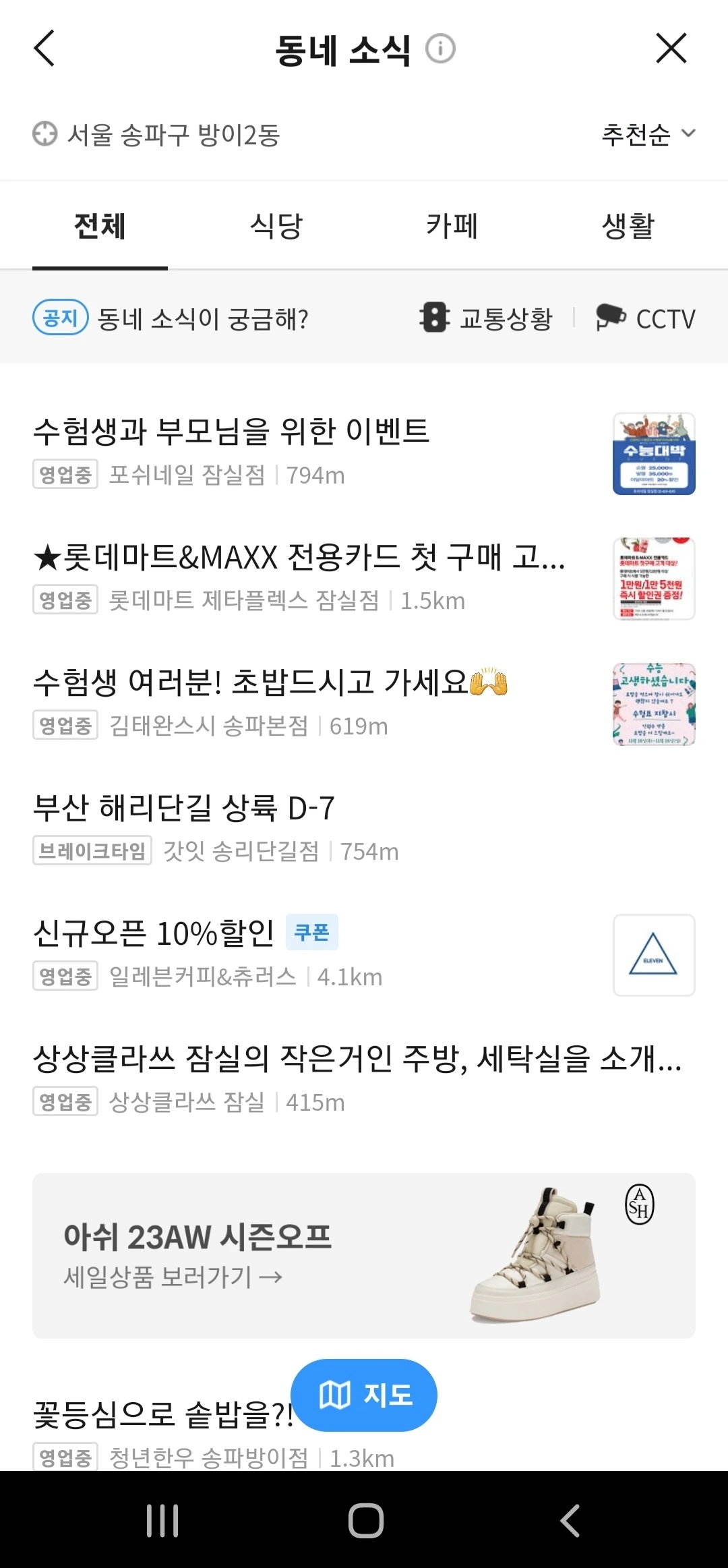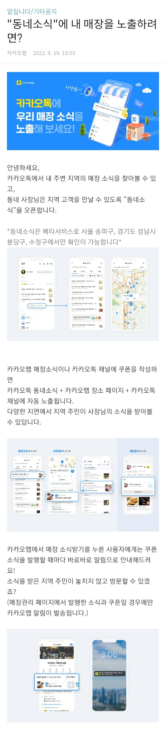 카카오톡은 10월에 지역기반 커뮤니티 서비스 '동네소식' 베타 버전을 선보였어요. 현재 서울 송파구, 경기 분당·수정구 등에서 베타 테스트를 진행하고 있어요. 제가 해당 동네라 저에게 뜬 것이네요! 동네소식은 이용자의 지역에 따라 날씨, 교통 등의 동네 정보를 공유하고 지역 근처의 매장 정보도 공유합니다. 카카오맵의 공지사항에는 동네소식에 매장을 노출하는 방법에 대해 자세히 설명되어 있습니다.