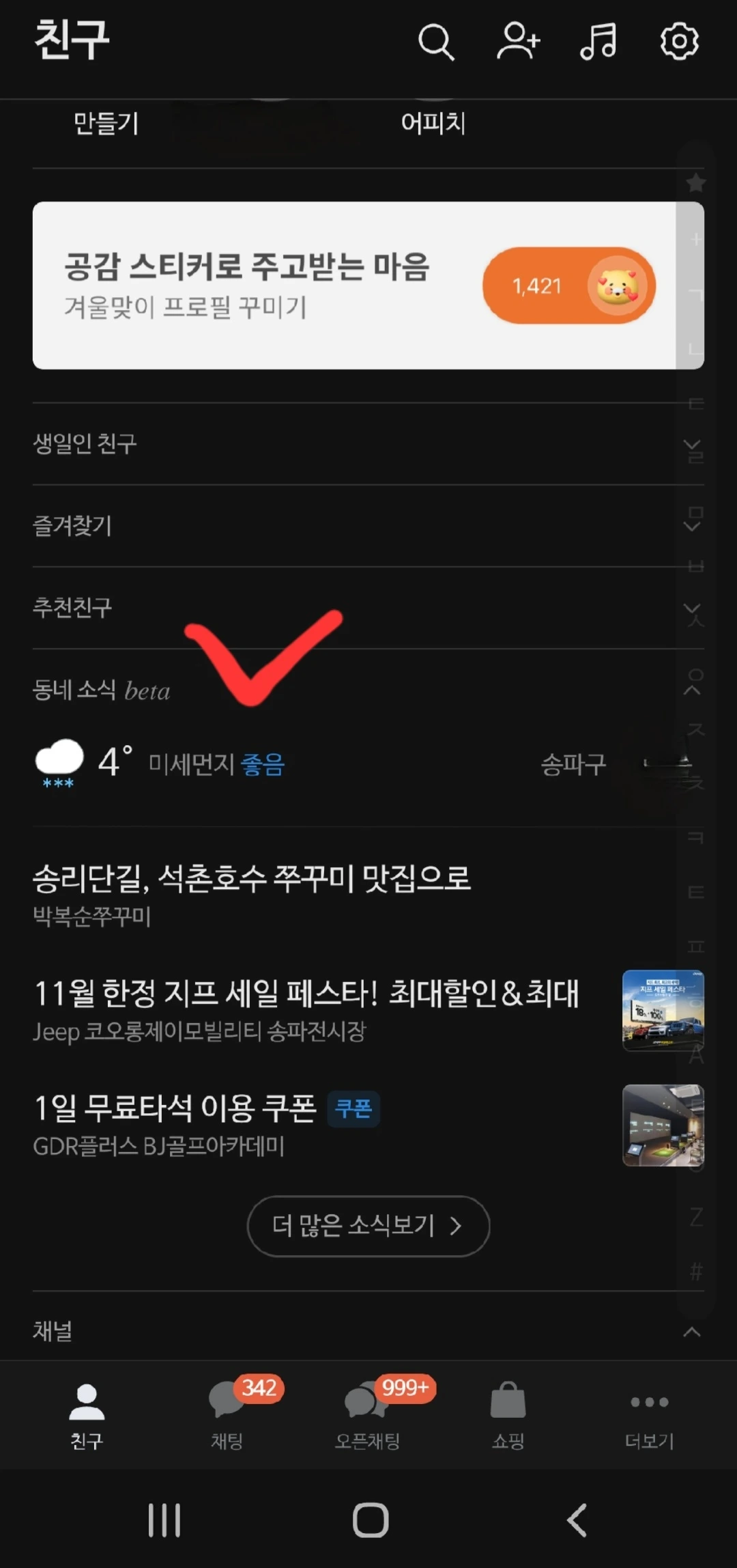 카카오톡의 시각적 피로도가 많이 증가하고 있습니다. 올해 신규서비스만 해도 인스타스토리와 비슷한 카카오펑이 친구 창 바로 하단에 고정으로 뜨고, 그 밑에는 어느새인가 광고 배너가 뜨기 시작했어요. 물론 카카오에서도 수익을 만들어야 하는 고충이 있겠지만, 필수 서비스 외의 광고 및 부가서비스가 너무 많아지고 있어요. 이젠 동네소식이라는 것까지 등장했네요. 그래도 일단 새로운 게 생기면 일단 파고 보는 스타일!