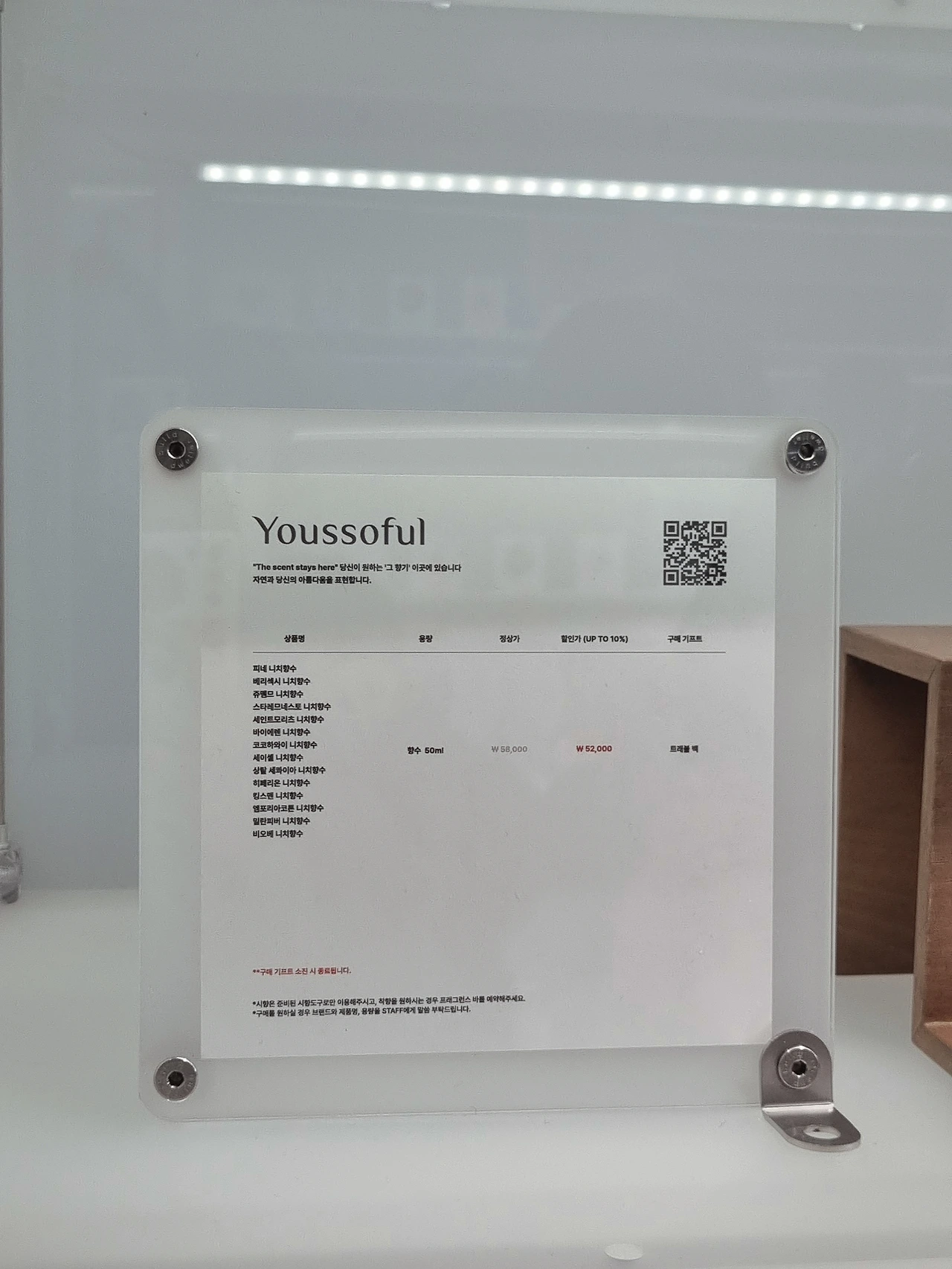 - 현장에서 향수 구매 시 선물 포장 서비스, 미니 향수공병, 브랜드 별 사은 품 등 다양한 구매 혜택
