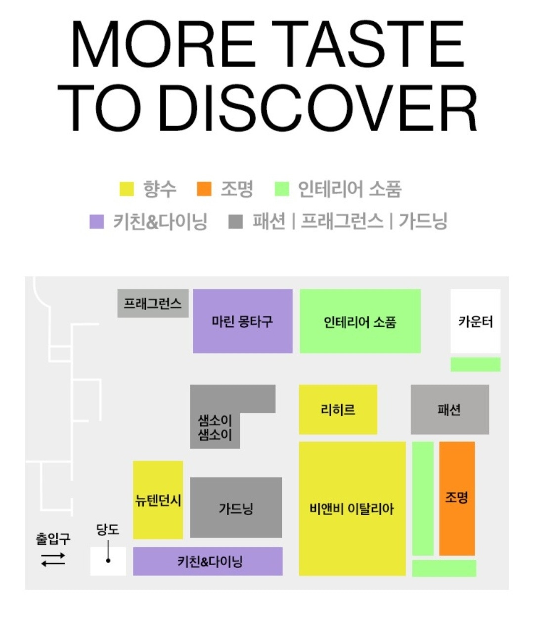 TTRS는 약 190평의 규모에, 아래와 같은 공간 구성으로 되어 있어요. 브랜드는 약 100여 개가 입점되어 있으며, 국내에 처음 소개되는 해외 브랜드를 메인으로 취급하는 것이 특징입니다.