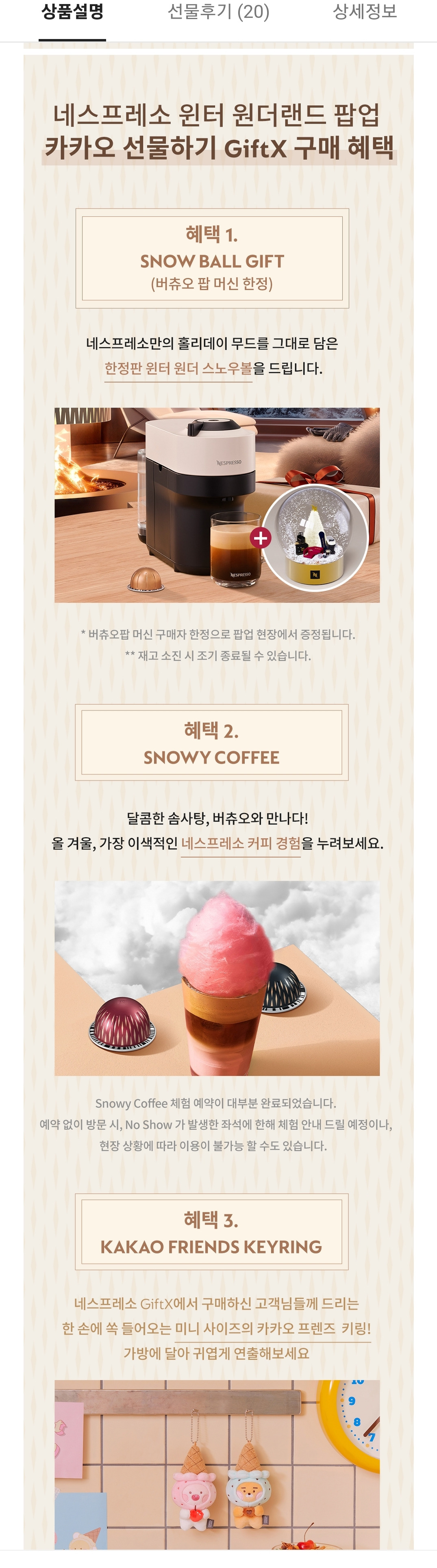 GiftX를 통해 방문한 모든 고객에게는 달콤한 솜사탕과 네스프레소 버츄오 커피의 콜라보인 ‘Snowy Coffee’를 맛볼 수 있는 체험권, 그리고 미니 사이즈의 카카오 프렌즈 키링을 받을 수 있어요. 카카오톡에서 버츄오 팝 머신을 구매하고 윈터 원더랜드를 방문한 고객들에게는 한정판 ‘윈터 원더 스노우볼’을 제공해요!
