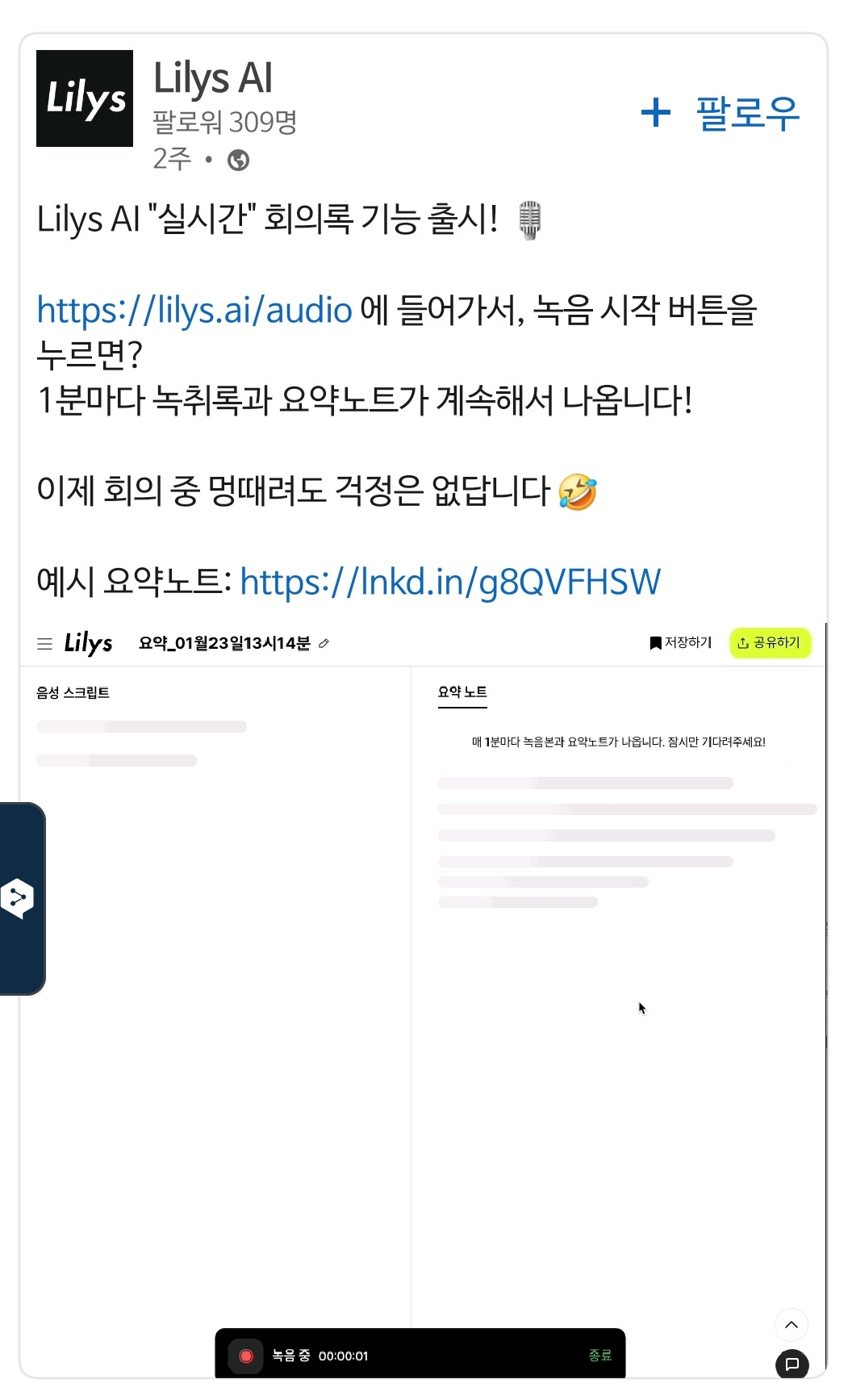 각각 보이저엑스와 뤼튼을 경험했던 오현수, 김예인 공동 대표가 창업한 스타트업입니다. 릴리즈는 “인간의 뇌에서 일어나던 ‘정보 소화 과정’을 소프트웨어로 가져와 생산성을 10배 올려주자”라는 비전 하에 정보 소화의 고통이 가장 크고 많이 발생하고 있는 ‘유튜브 영상 요약’ 제품을 가장 먼저 출시했습니다.