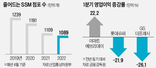 올해 1분기 실적 역시 안 좋습니다. SSM 시장 점유율 1위 롯데슈퍼는 지난 1분기 3,492억 원의 매출을 기록하며 전년 동기 대비 10% 줄었으며, 영업이익 역시 25억 원으로 전년 동기 대비 21.9% 감소했습니다. GS더프레시의 경우 매출은 6.2% 늘었지만, 영업이익은 26.1% 급감했습니다. 이마트 에브리데이는 매출은 3,320억 원으로 전년 대비 5.4% 늘었고, 영업이익도 22.2% 증가했습니다. 다만 2020년과 비교하면 역시 감소 추세입니다. 홈플러스 익스프레스도 적자를 면하는 수준에서 버티고 있는 것으로 알려져 있습니다.