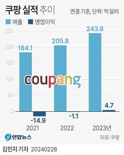 쿠팡, 2023년 전년 대비 매출은 20% 증가했고, 영업이익은 흑자 전환에 성공했어요.