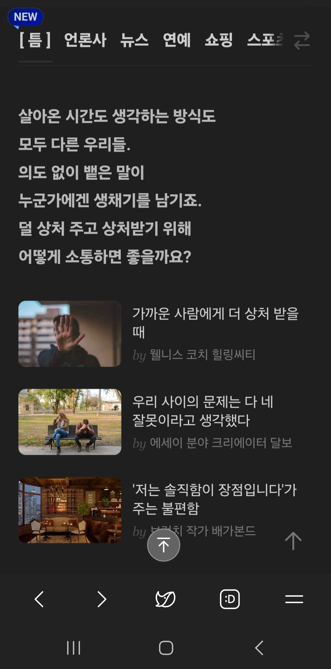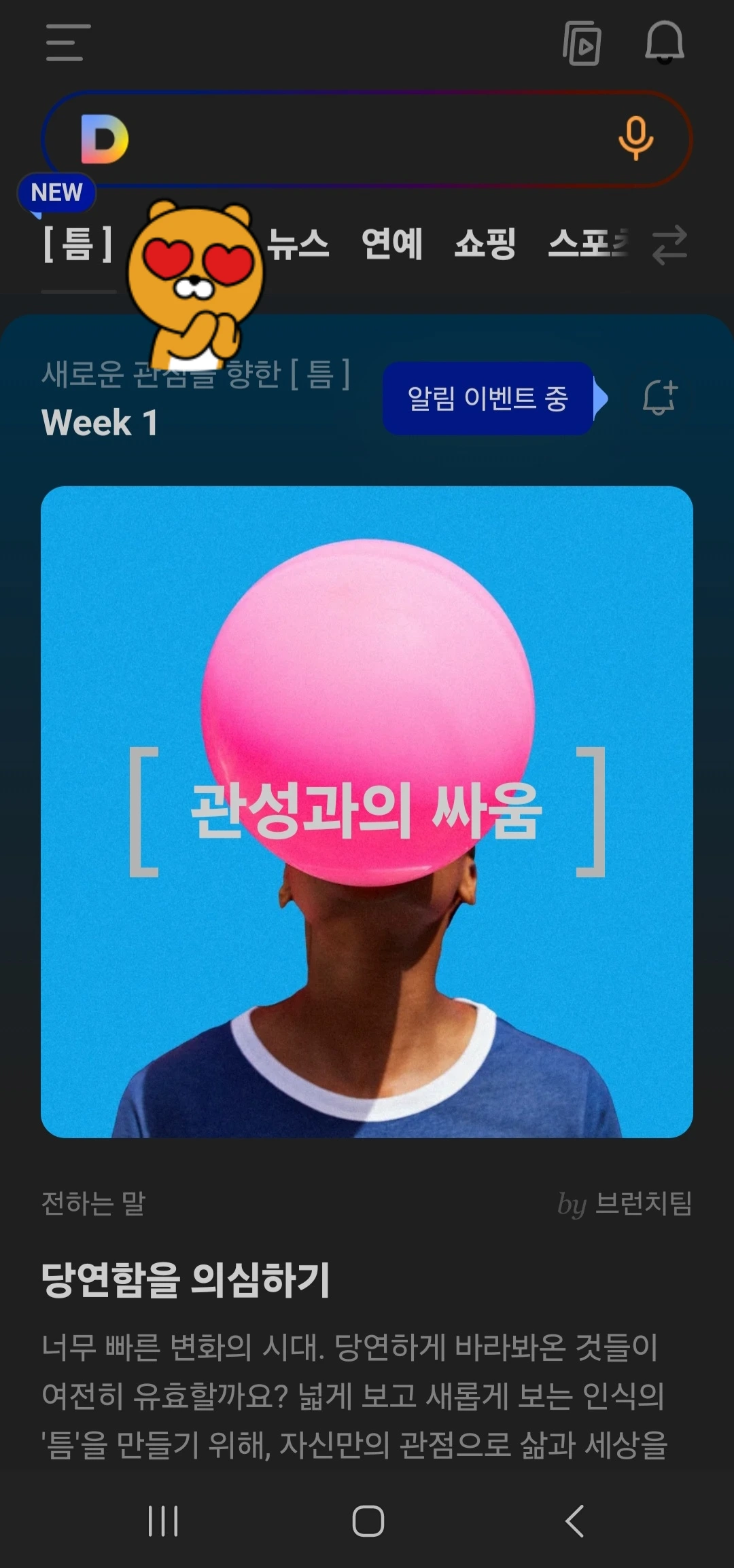 1️⃣ 카카오는 최근 '틈'이라는 새로운 콘텐츠 공간을 모바일 다음(Daum) 첫 화면에 선보였어요. 이 공간은 유튜브 숏츠나 인스타그램 릴스와 같은 짧고 자극적인 콘텐츠가 지배하는 현시점에서 천천히 사유할 수 있는 시간을 제공하려는 목적을 가지고 있어요.