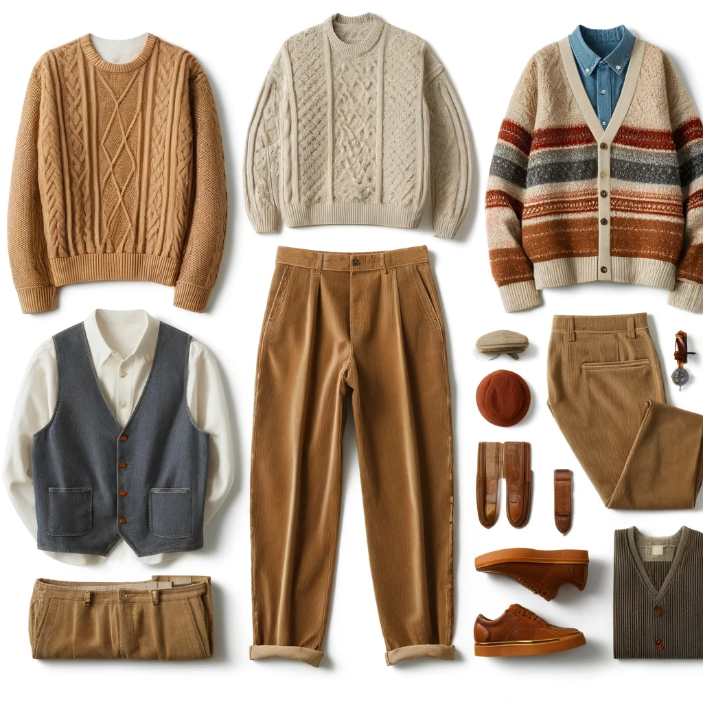 들을 매치하는 것을 말해요. 주로 니트, 조끼, 루즈한 실루엣의 셔츠나 바지를 포함해요. 클래식한 패턴과 소재가 특징이죠.