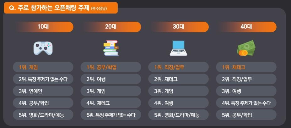 각 연령대별로 선호하는 채팅방 주제가 조금씩 다른 것도 흥미로운데요. 예를 들어, 10대는 게임이나 연예인 관련 토픽을, 20대는 학업이나 여행, 30대는 직장이나 재테크 관련 토픽을, 40대는 재테크나 직장 관련 토픽에 더 많은 관심을 보이고 있어요. 오픈채팅방 참여자들은 정보를 교류하거나, 취미/관심사가 맞는 사람과 대화하기 위해 이러한 플랫폼을 활용하고 있습니다.