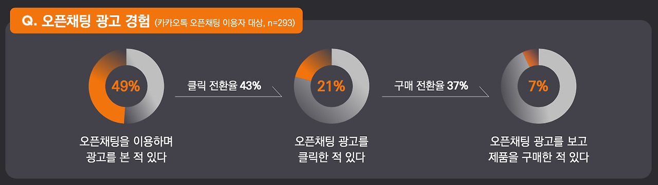 오픈채팅 광고에 대한 조사도 흥미로웠는데요. 오픈채팅을 이용하며 광고를 본 적 있다는 응답이 49%, 오픈채팅 광고를 클릭한 적이 있다는 응답은 21%로, 클릭 전환율은 43%였다. 여기서 오픈채팅 광고를 보고 제품을 구매한 적이 있다는 응답은 7%로 구매 전환율은 37%였어요.