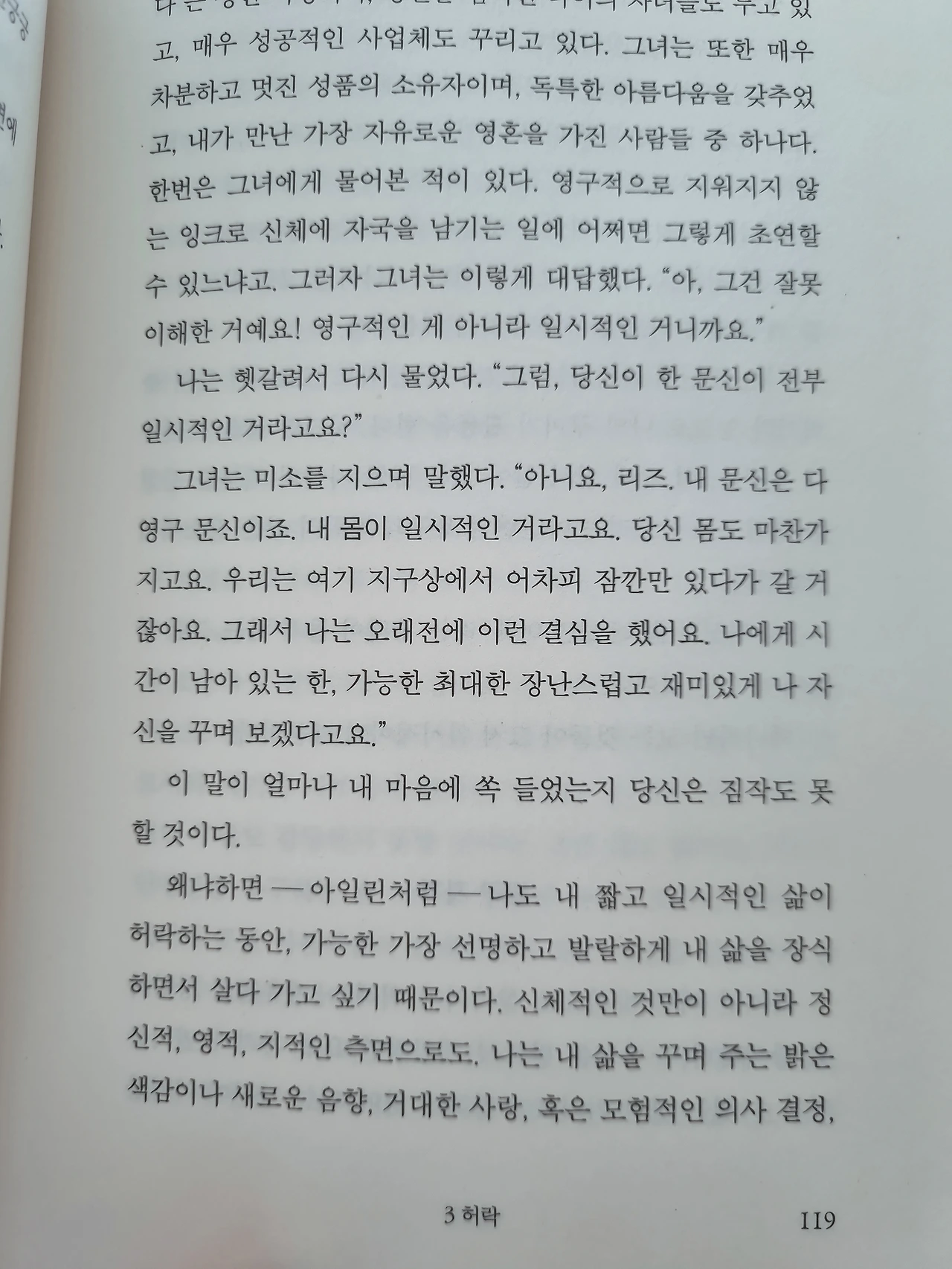 그녀는 미소를 지으며 말했다. "아니요, 리즈, 내 문신은 다 영구 문신이죠. 내 몸이 일시적인 거라고요. 당신 몸도 마찬가지고요. 우리는 여기 지구 상에서 어차피 잠깐만 있다가 갈 거잖아요. 그래서 나는 오래전에 이런 결심을 했어요. 나에게 시간이 남아 있는 한, 가능한 최대한 장난스럽고 재미있게 나 자신을 꾸며 보겠다고요."