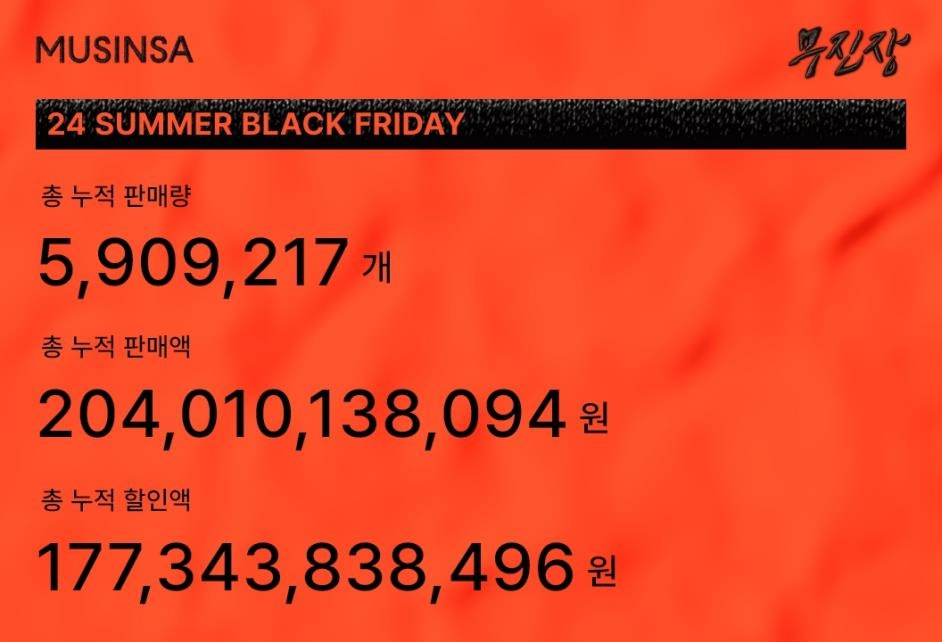 무신사는 상반기 최대 규모 할인행사인 '무진장 여름 블랙프라이데이'를 통해 10일 동안 2천40억원의 판매액을 기록했다고 밝혔어요. 이번 행사는 6월 23일 오후 7시부터 7월 3일 자정까지 열렸으며, 2,700여 개 입점 브랜드 상품 30만 종을 최대 80% 할인하여 제공했어요. 작년 여름 블랙프라이데이보다 판매액은 45% 증가했고, 판매량은 58% 늘어난 590만 개에 달했어요.