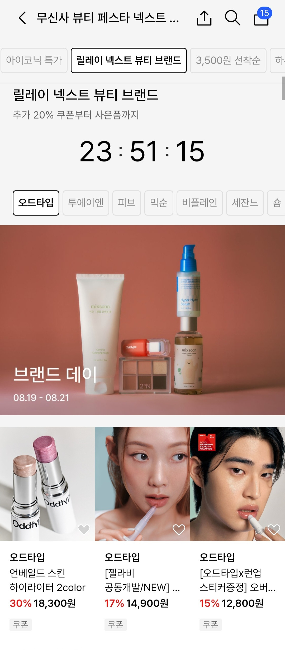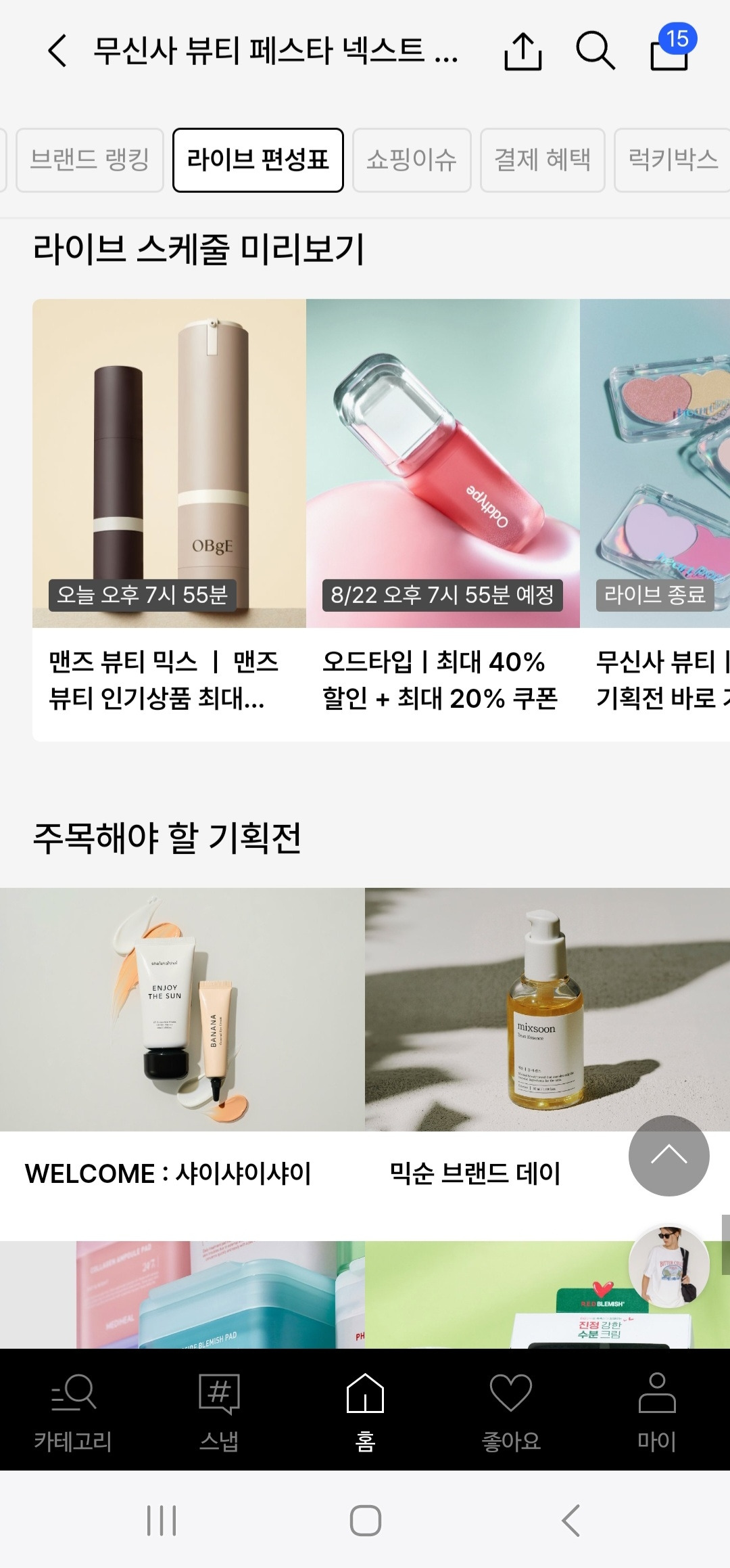 이 행사는 오프라인뿐만 아니라 온라인에서 먼저 시작되었는데요. 무신사 뷰티 페스타는 무신사 앱에서 이달 19일부터 다음 달 8일까지 3주간 진행될 예정이에요.