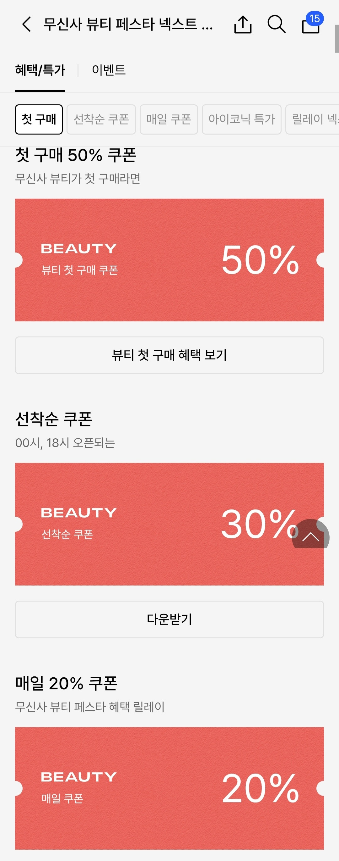 올해 무신사 뷰티페스타 행사는 확실히 작년보다 규모가 커진 느낌이긴 해요. 일단 쿠폰이 기본 20%부터 시작하고 첫 구매 쿠폰의 할인률이 높아서 신규 고객의 유입이 기대되고 있어요.