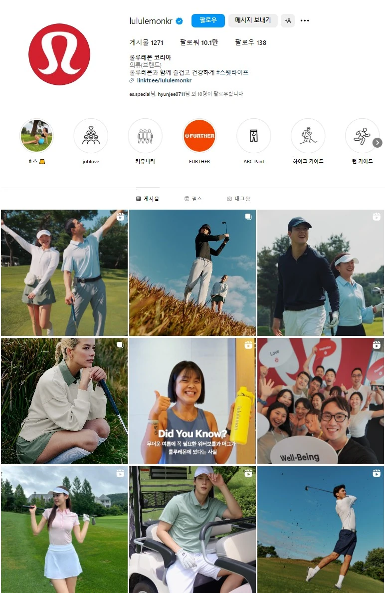 룰루레몬의 최근 인스타그램 피드를 보면 룰루레몬이 골프 라인에 얼마나 진심인 지를 알 수 있어요. 다양한 기능성 웨어를 소개하고, 룰루레몬 앰배서더 성빈, 다혜를 통해 라운딩 웨어도 추천하고 있죠.