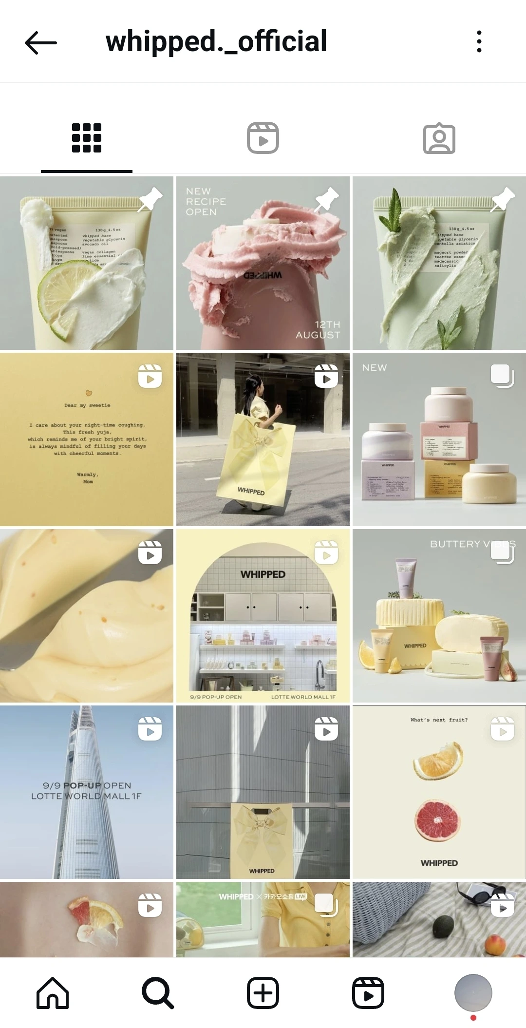 휩드는 초반에는 자사몰 단골 고객을 늘리기 위한 인스타그램 마케팅에 집중했다고 해요. 프로모션 등을 강조하기 보다는 계속 휘핑크림 제형의 몽글몽글한 영상을 보여주며 고객들에게 브랜드 인지도를 높였죠.