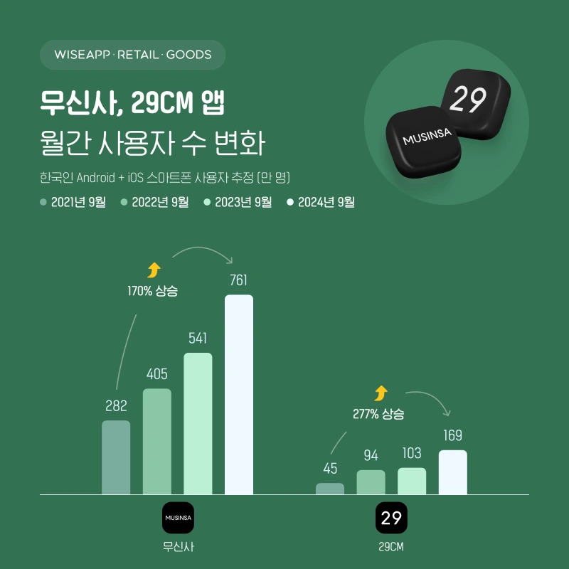 29CM의 앱 사용자는 169만 명으로 기록되며, 이는 앱 출시 이후 역대 최대치예요. 이와 같은 사용자의 증가는 29CM가 단순히 패션 쇼핑몰로서의 역할을 넘어 고객 경험 중심의 플랫폼으로 자리 잡고 있음을 보여주는 중요한 지표예요.